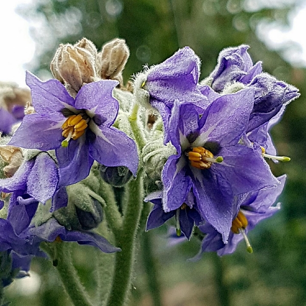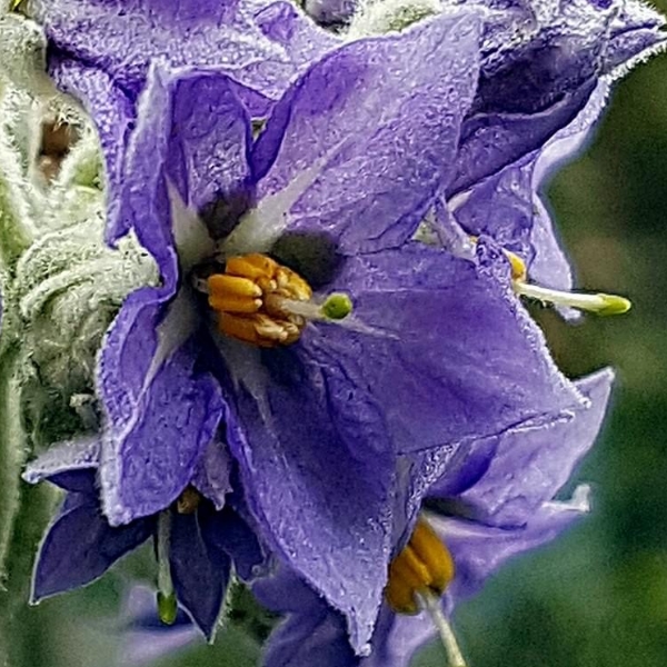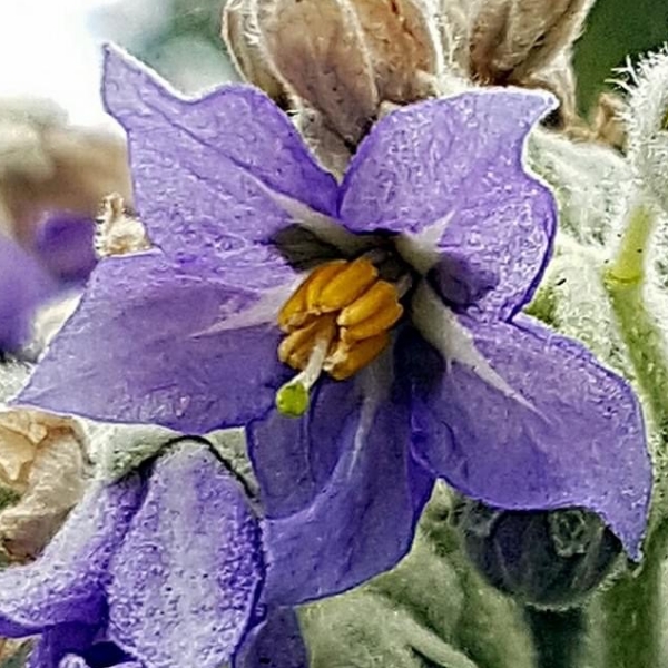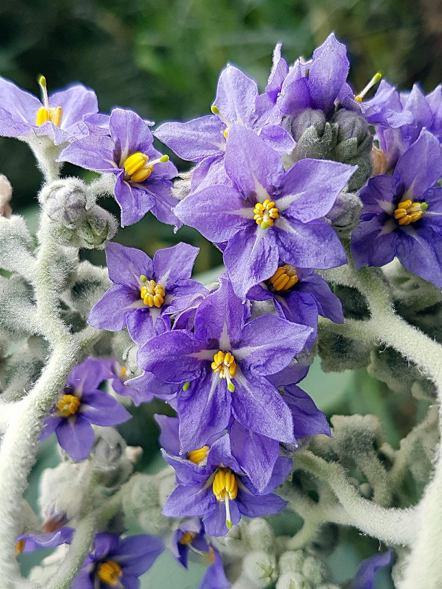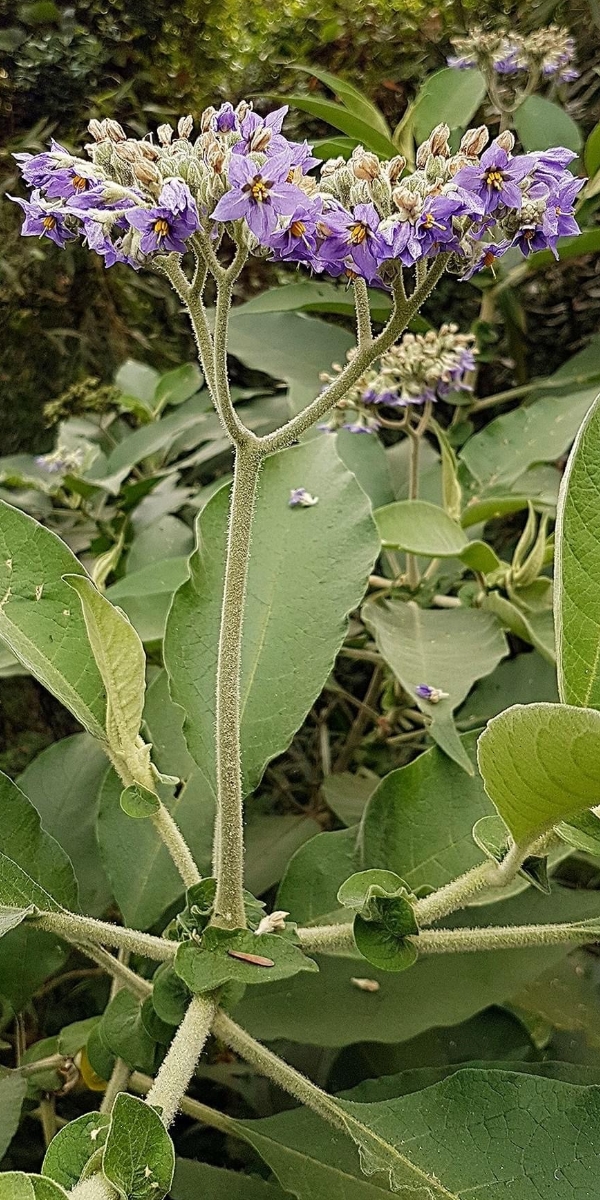 (歸化種;原生於南美洲的東南部;常綠灌木至小喬木;全株密被白色絨毛或星狀毛;單葉互生,長橢圓形至長卵狀披針形,葉背灰白色,葉腋多耳狀小葉;2叉聚繖花序,頂生;花瓣5枚,紫色;雄蕊5枚,花藥聚合,雌蕊突出,頂端綠色;漿果圓形,成熟黃色,徑約1~2公分;果實含茄鹼,具毒性)