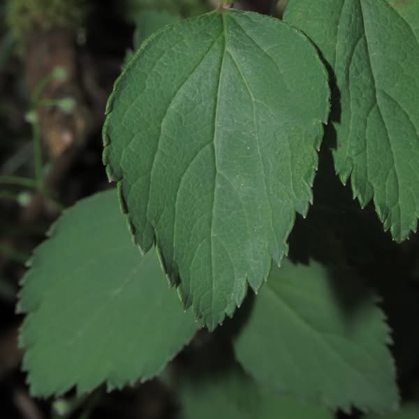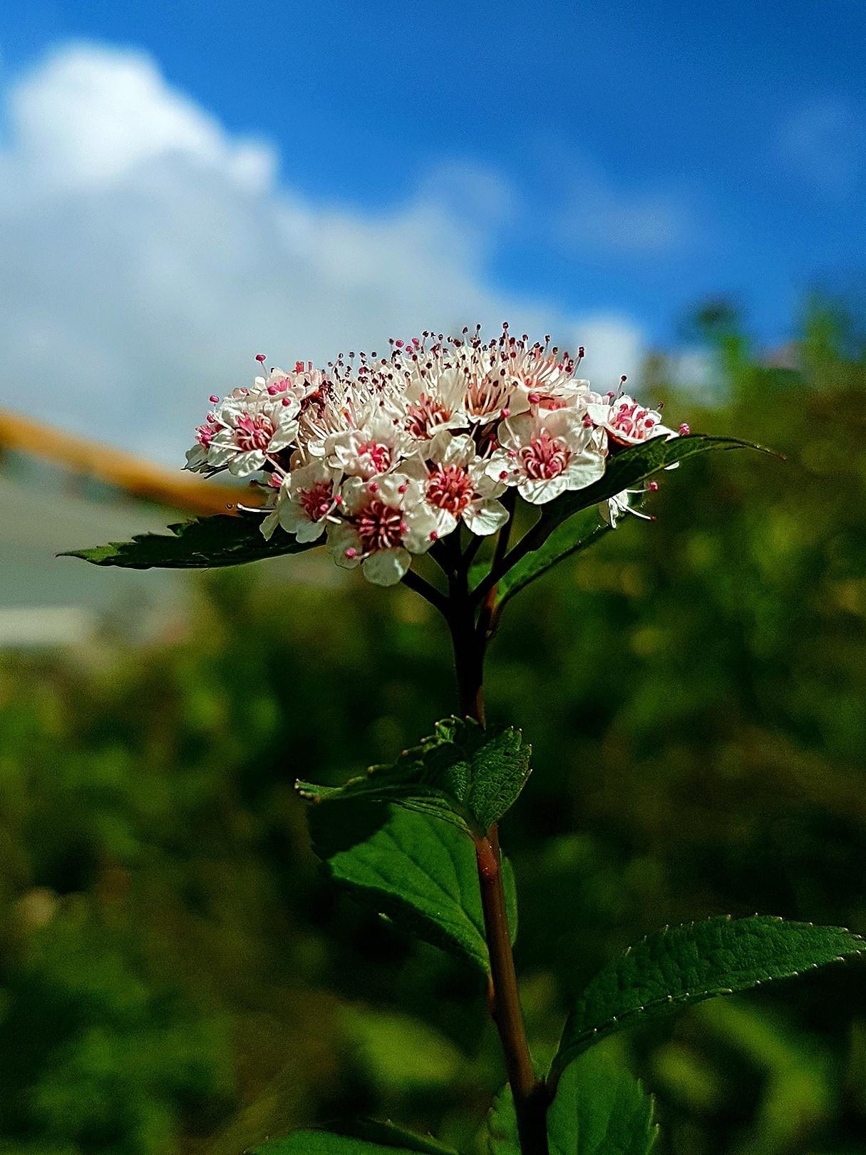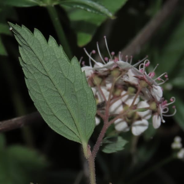 靠近先端的前半部重鋸齒緣,靠近葉柄的後半部為全緣,被短毛,具短柄;聚繖花序,頂生;花瓣5枚,白色;雄蕊多數,花絲細長,花藥粉紅色)