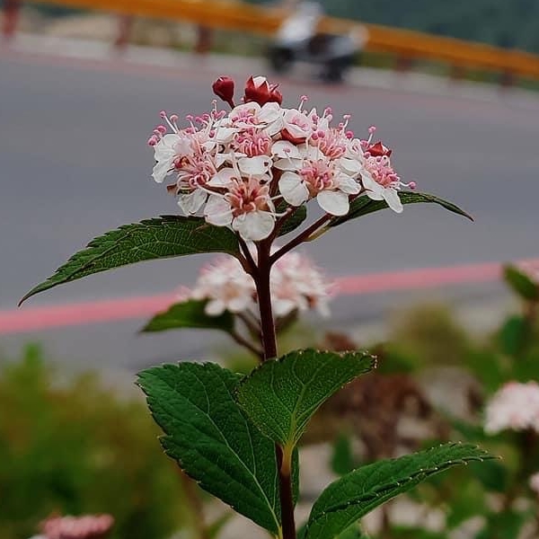 ![]() 上面照片:小花老師拍攝 (小枝密被微毛;聚繖花序;花絲細長,花藥粉紅色;單葉互生,卵形、長卵形、橢圓形至長橢圓形,靠近先端的前半部重鋸齒緣,靠近葉柄的後半部為全緣,被短毛,具短柄) |