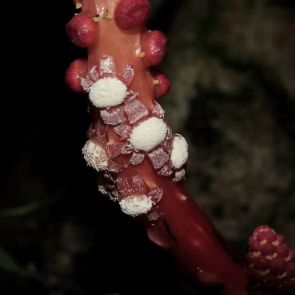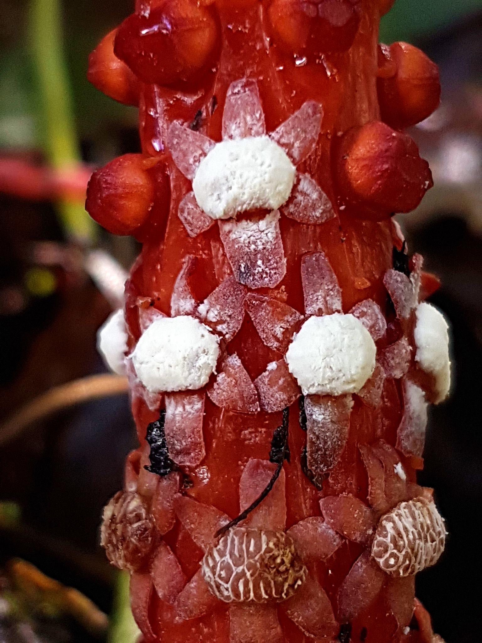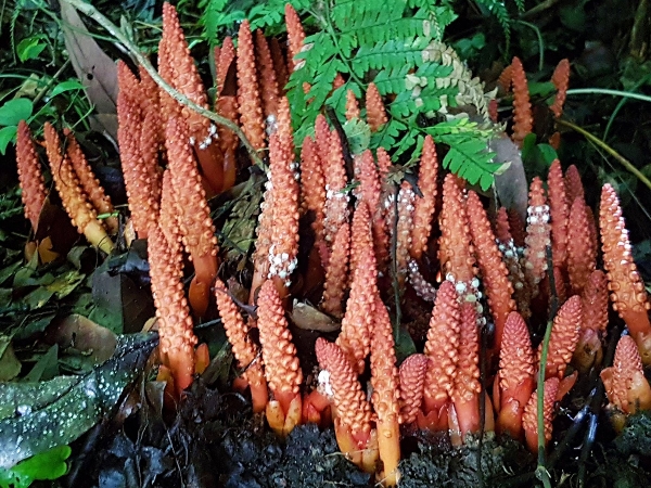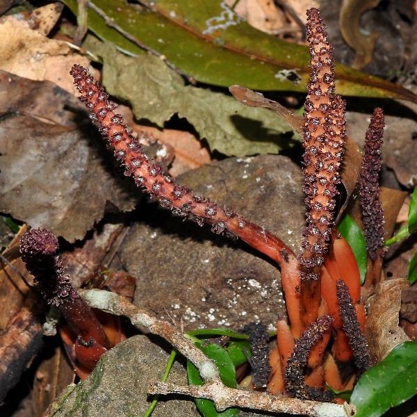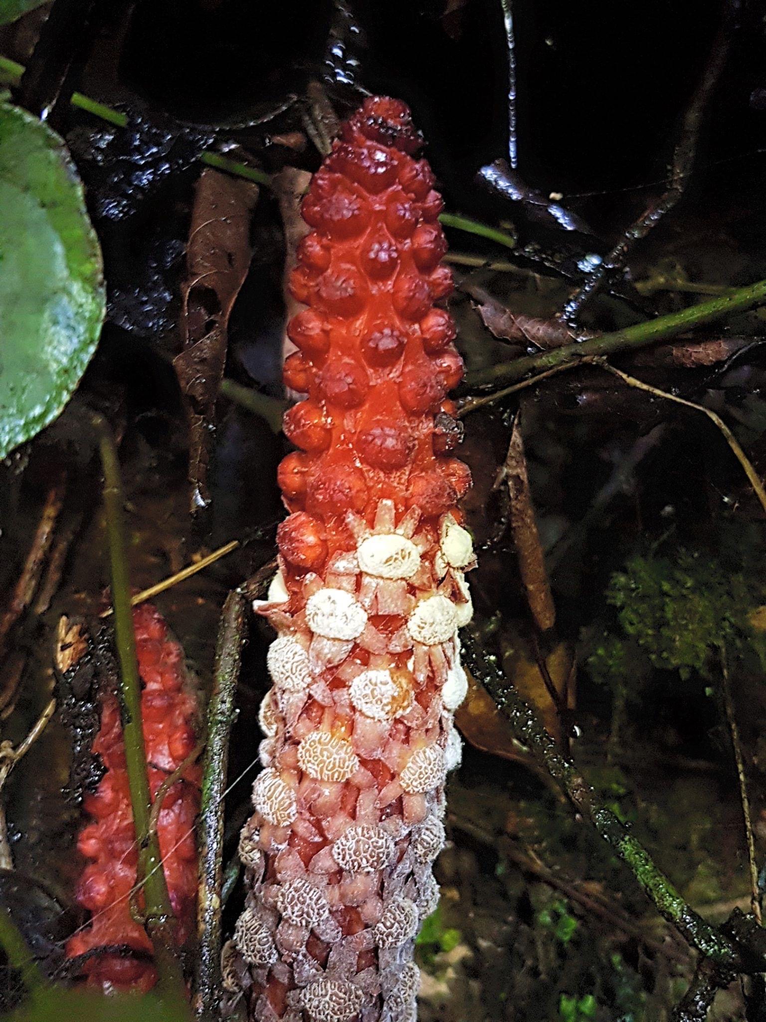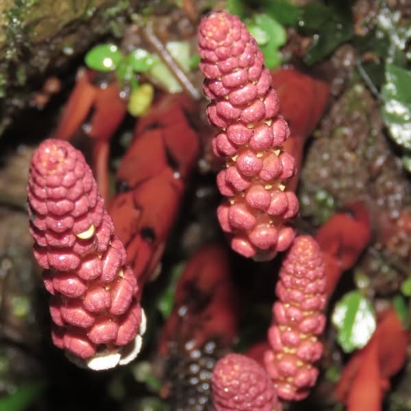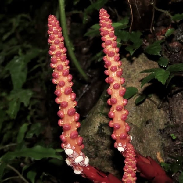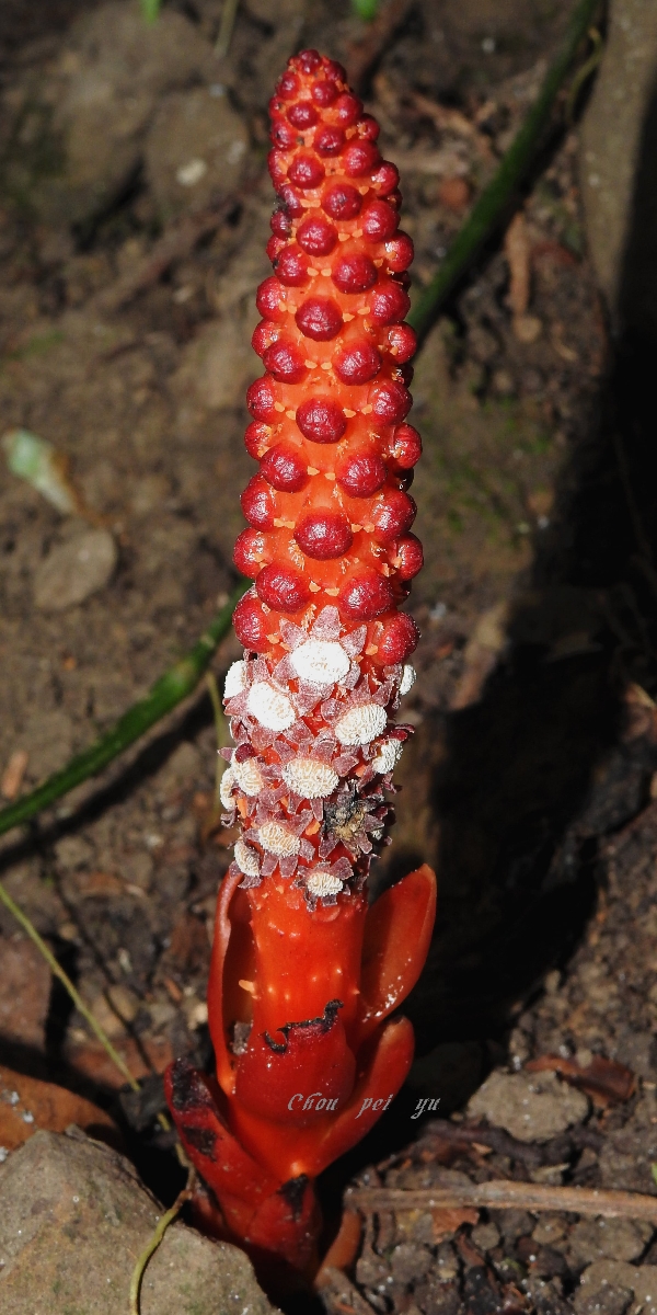 (原生種;原生於台灣、中國大陸至馬來西亞;寄生性草本;寄生於大樹幹的根部;全株紅色;雌雄異株;地下莖塊狀;莖直立;單葉互生,鱗片狀;穗狀花序,頂生;雌花序卵形至長卵形,無花被片;雄花序長柱狀,花被片約6枚(或多或少);花兒散發特殊味道,能吸引蒼蠅吸食,傳播花粉與授粉)