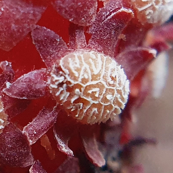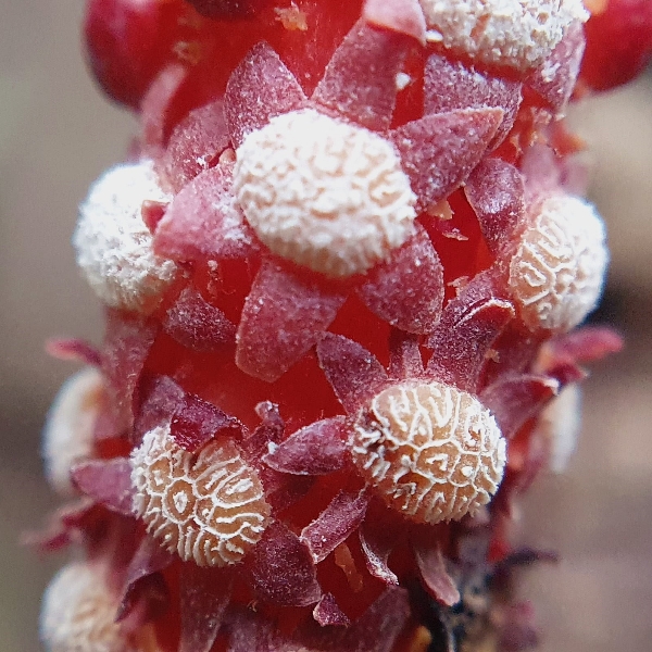 ![]() 上面照片:周佩玉拍攝 (寄生性草本;寄生於大樹幹的根部;全株紅色;雌雄異株;莖直立;單葉互生,鱗片狀;穗狀花序,頂生;雄花序長柱狀,花被片約6枚(或多或少)) |