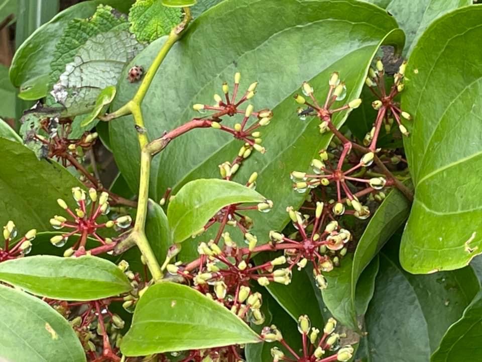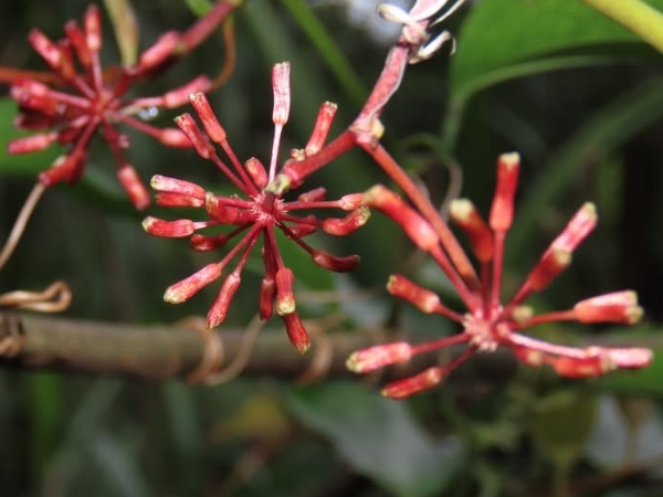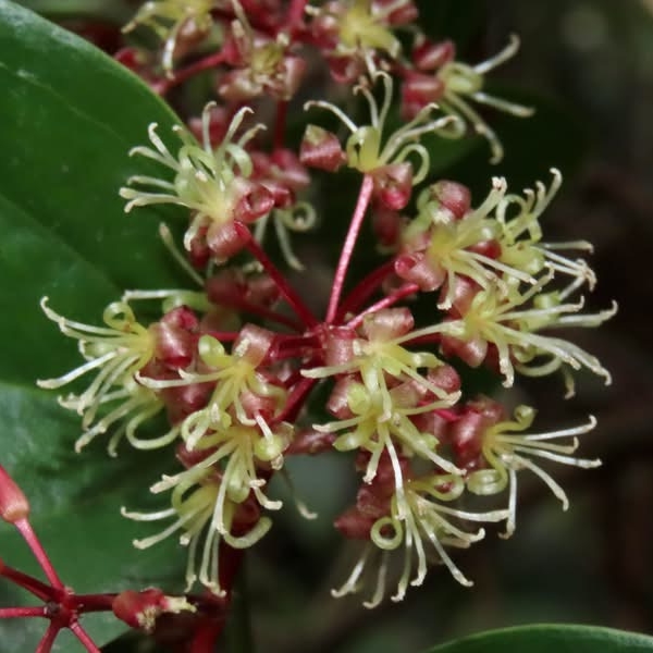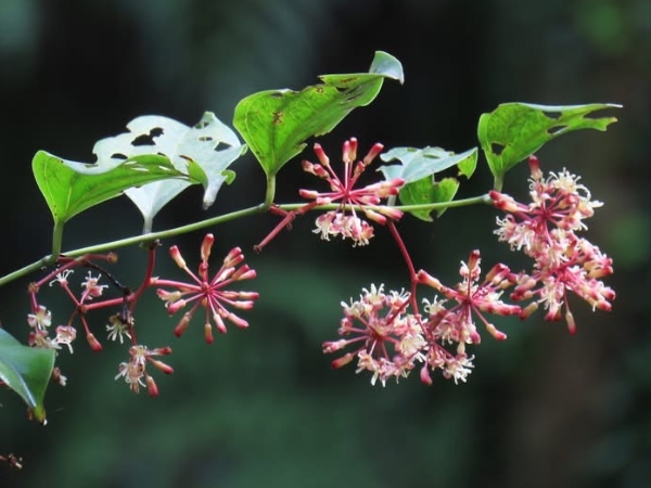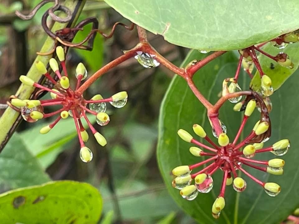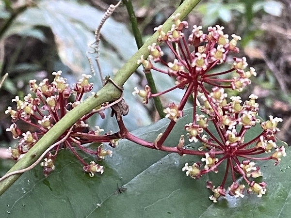 前緣兩側通常長出2條細長捲鬚,可纏繞攀爬;花朵單性,雌雄異株;圓錐花序,腋生,由2~7個繖形花序排成總狀,花序梗呈紅色;花被片6枚,內側黃色,外側紅色;雄花具6枚細長的雄蕊,無雌蕊;雌花雌蕊3叉,無雄蕊;漿果橢圓形,成熟紫黑色)