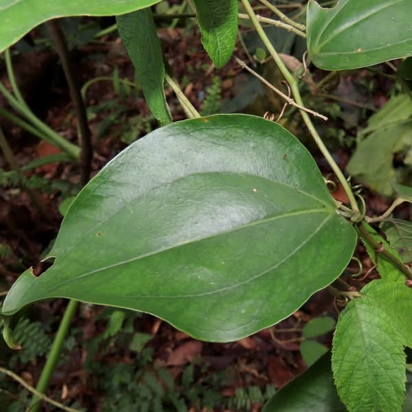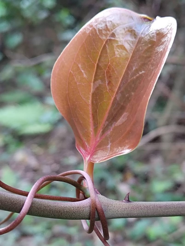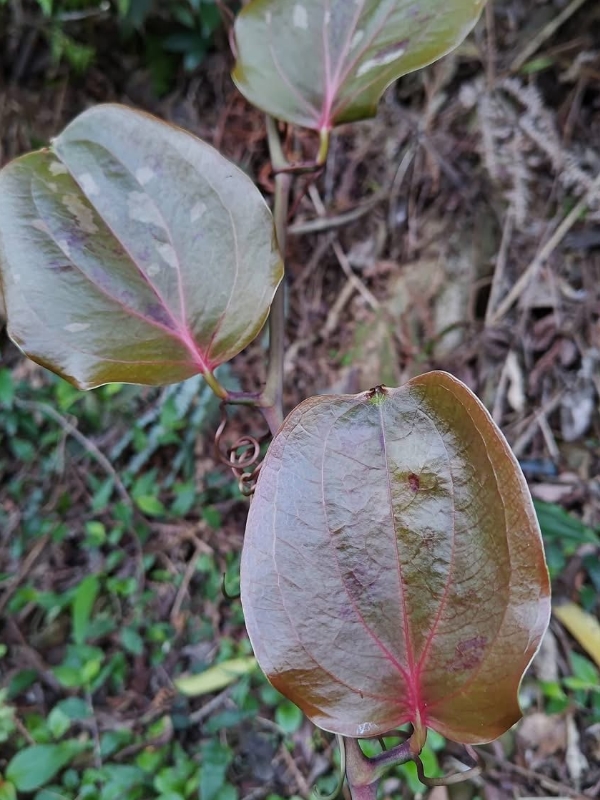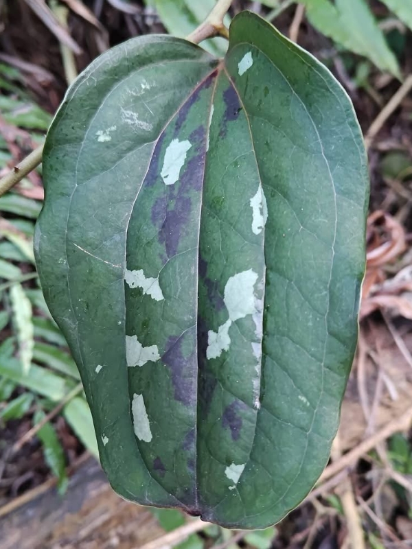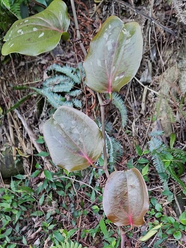 ![]() 上面照片:林美燕拍攝 (單葉互生,卵形、長卵形至長卵狀披針形,先端微凸,葉面有時呈迷彩狀(有紫紅色或白色斑塊);有五條主脈,中間三條靠近基部合生;葉柄常彎折;具葉鞘,通常長度不到葉柄一半, 前緣兩側通常長出2條細長捲鬚,可纏繞攀爬) |