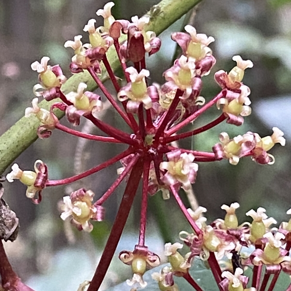 ![]() 上面照片:小花老師拍攝 (雄株;花朵單性,雌雄異株;圓錐花序,腋生,由2~7個繖形花序排成總狀,花序梗呈紅色;花被片6枚,內側黃色,外側紅色;雄花具6枚細長的雄蕊,無雌蕊; 雌花雌蕊3叉,無雄蕊) |