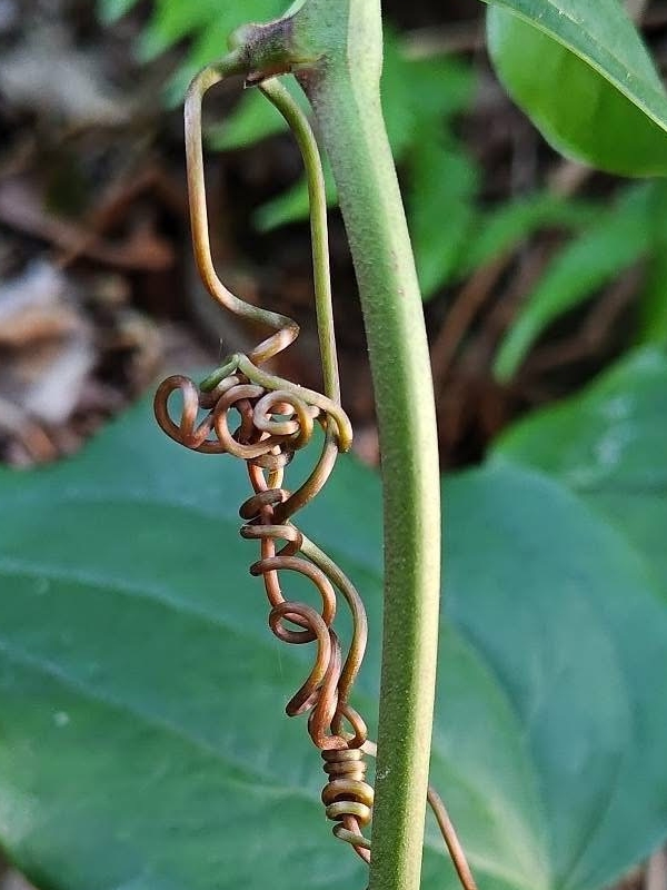 ![]() 上面照片:林美燕拍攝 (葉柄常彎折;具葉鞘,通常長度不到葉柄一半, 前緣兩側通常長出2條細長捲鬚,可纏繞攀爬) |
