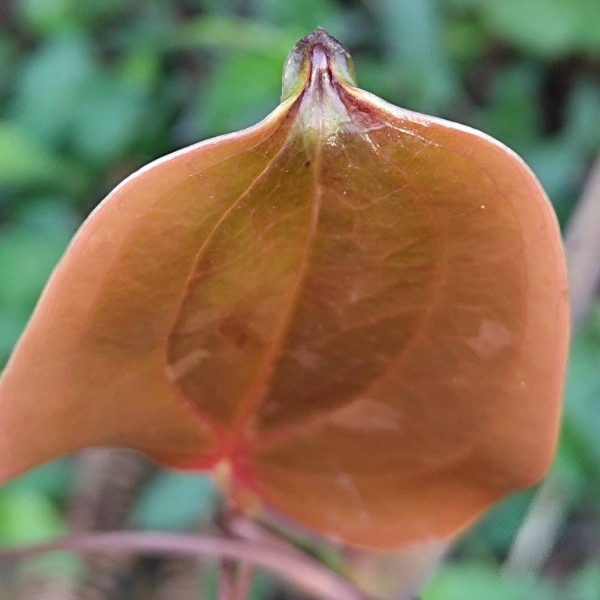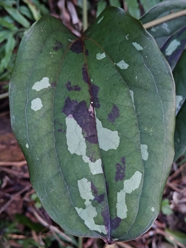 ![]() 上面照片:林美燕拍攝 (葉面有時呈迷彩狀(有紫紅色或白色斑塊);有五條主脈,中間三條靠近基部合生) |