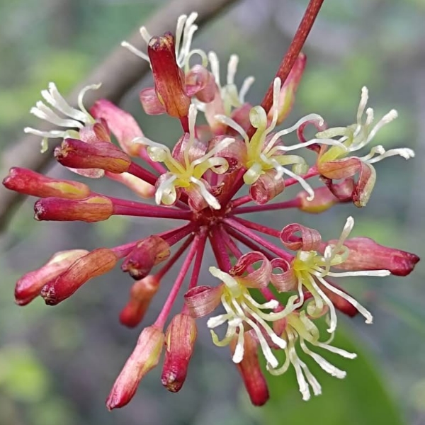 ![]() 上面照片:林美燕拍攝 (雄株;花朵單性,雌雄異株;圓錐花序,腋生,由2~7個繖形花序排成總狀,花序梗呈紅色;花被片6枚,內側黃色,外側紅色;雄花具6枚細長的雄蕊,無雌蕊; 雌花雌蕊3叉,無雄蕊) |