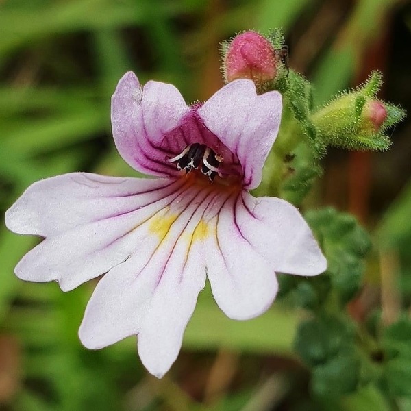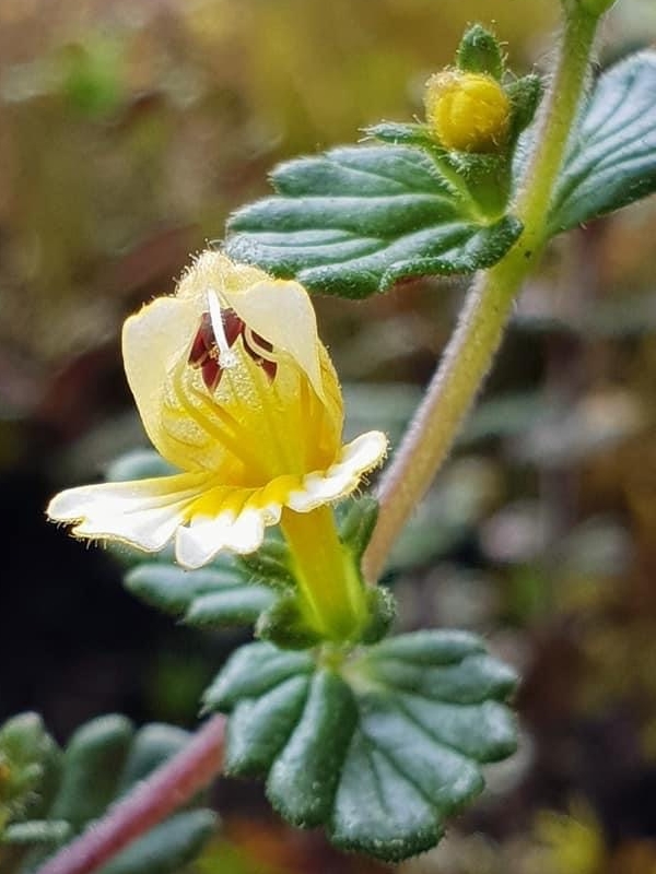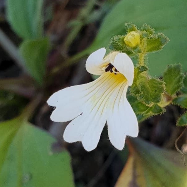 (台灣特有種;多年生小草本;全株密被腺毛,故又稱多腺毛小米草;單葉對生,鈍鋸齒緣,密被腺毛,無柄;花朵單生葉腋,上唇紫色,下唇白底帶黃斑,具紫色條紋;蒴果長卵形)