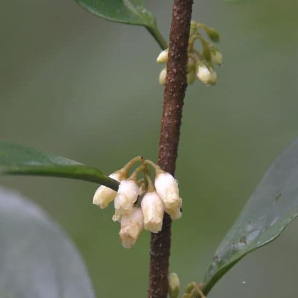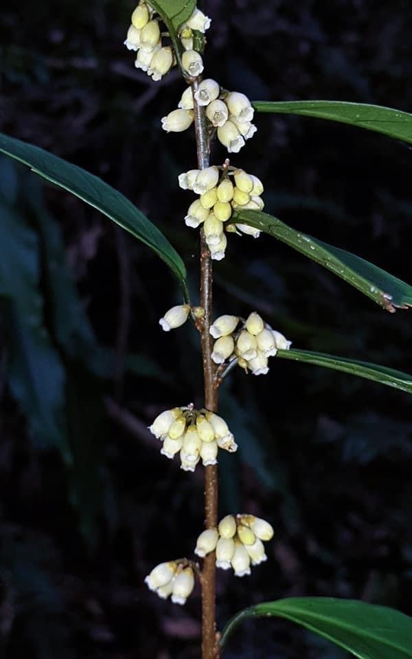 (原生種;原生於台灣、日本、高麗半島、中國大陸和越南;台灣物種名錄標名山桂花;維基百科標名杜莖山,杜莖山屬;常綠灌木,枝條下垂性;單葉互生,橢圓形至長橢圓形,全緣或中上部疏鋸齒緣;總狀花序,腋生,花冠筒狀鐘形,黃白色;漿果球形,成熟白色)