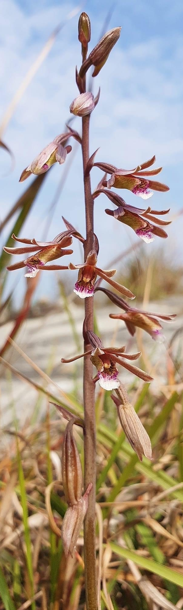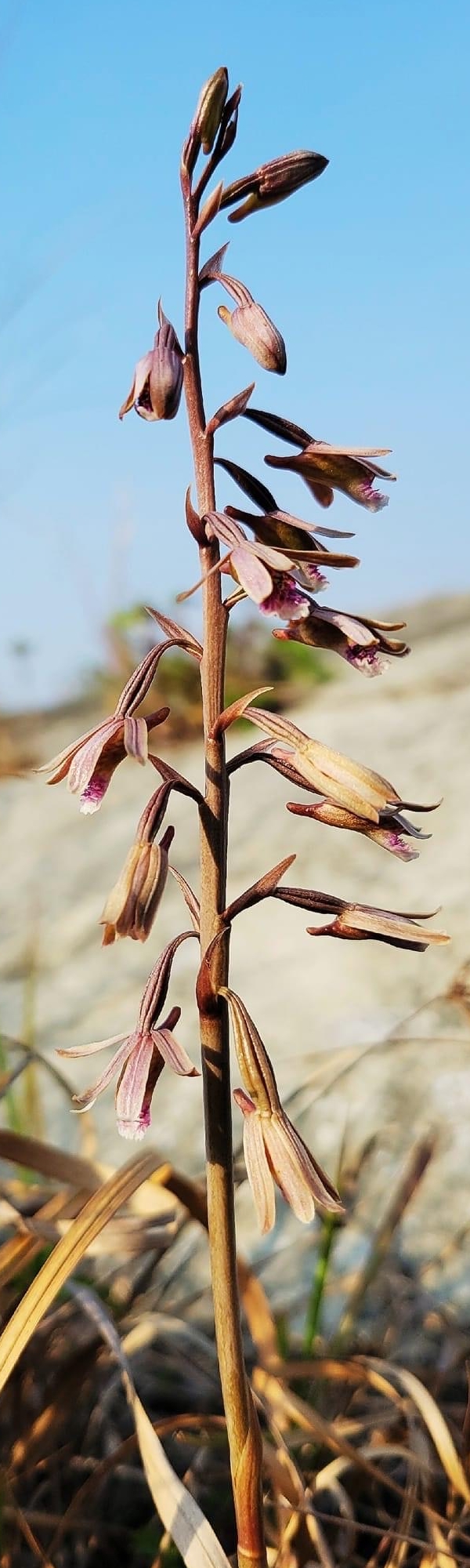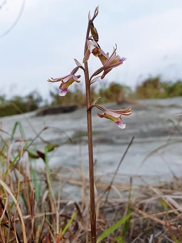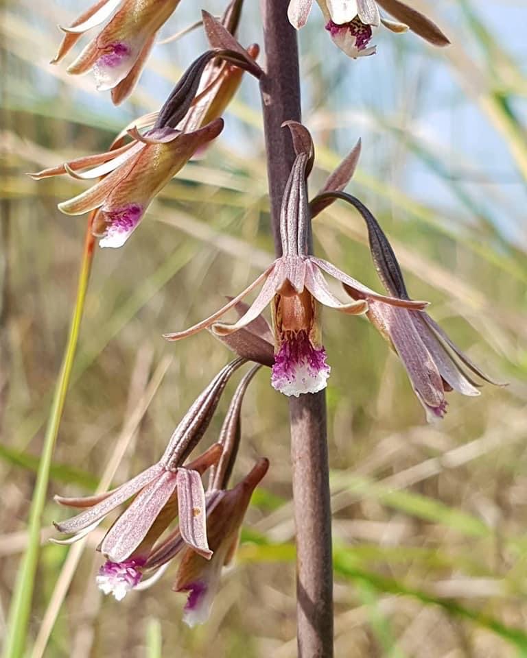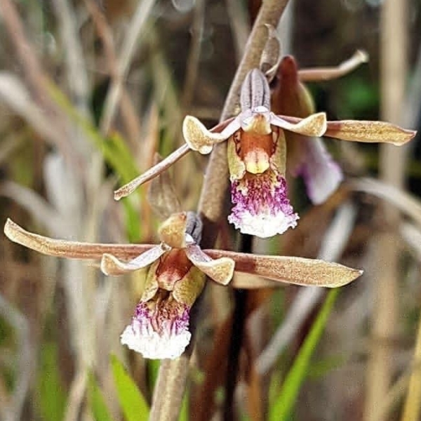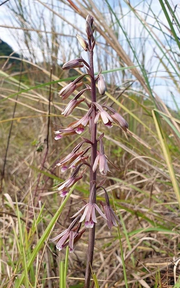 (原生種;台灣物種名錄標名紫芋蘭,別名瀨川氏芋蘭,附有照片;瀨川氏芋蘭另有學名,為不同物種;地生蘭;假球莖卵形;葉片線形,禾草狀;開花時,葉片己不存;花序有花10幾朵,花朵半張,下垂狀,暗紫色;花萼線形,紫色;蒴果長橢圓形)