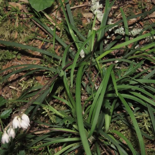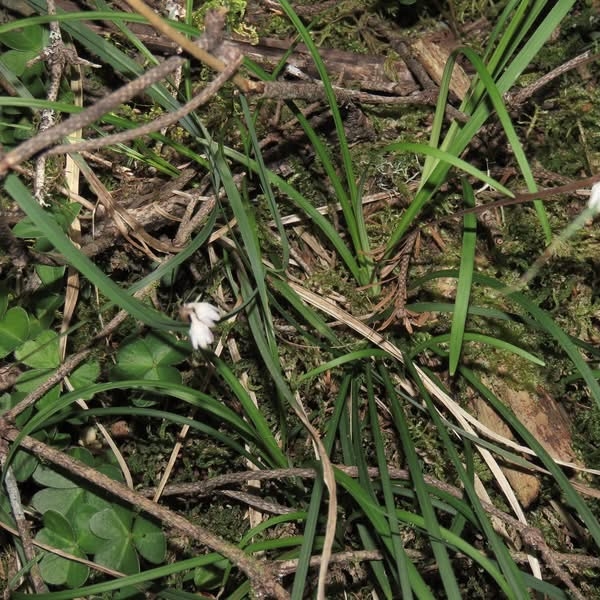 (原生種;台灣物種名錄標名間型沿階草,別名長梗沿階草、扁柄沿階草、玉龍草、書帶草、沿階草,附有照片;多年生草本;分布於中高海拔;具塊莖;單葉互生,基部叢生,線形,細鋸齒緣,寬約0.5公分,長可達50公分以上;總狀花序,葶狀,花朵小型,白色至紫色,花藥綠色;蒴果卵形,成熟紫黑色)