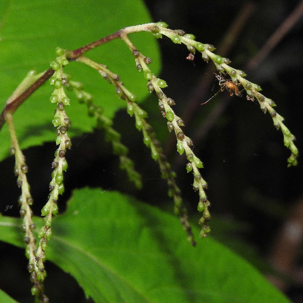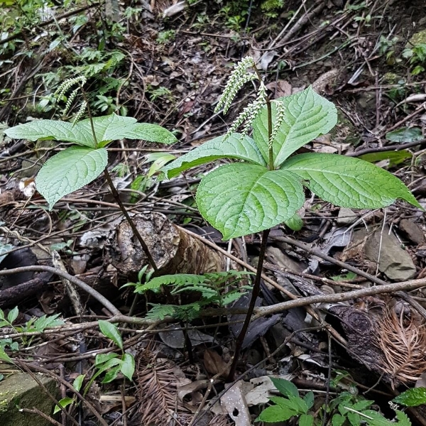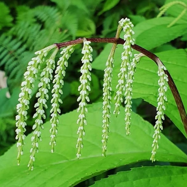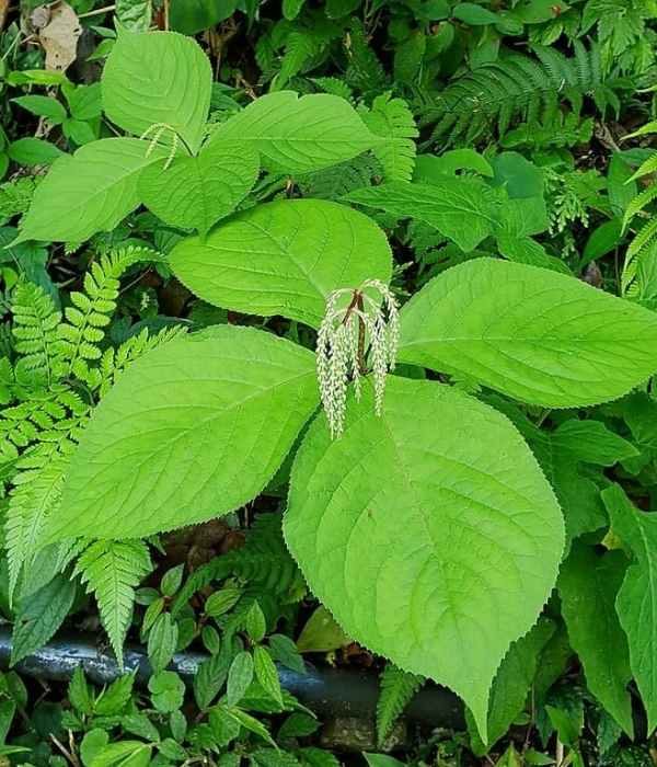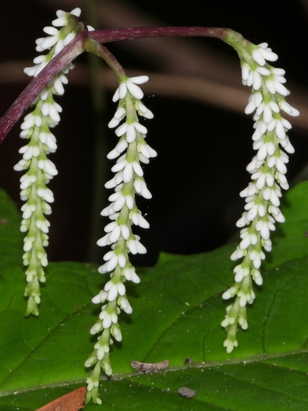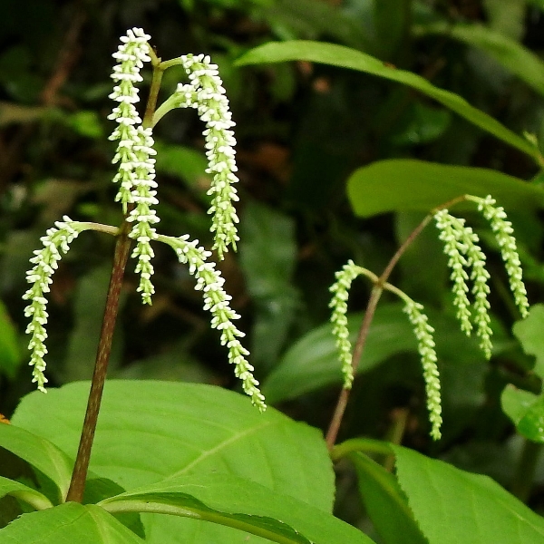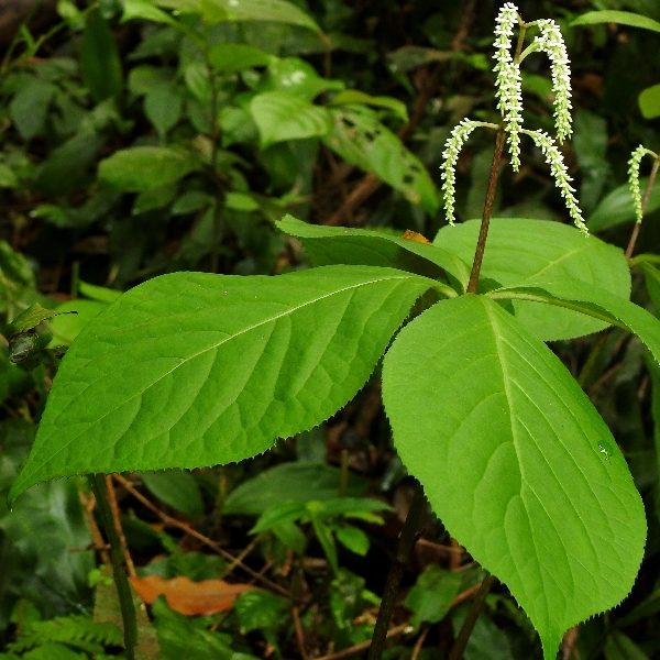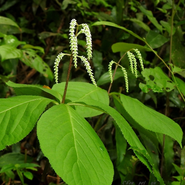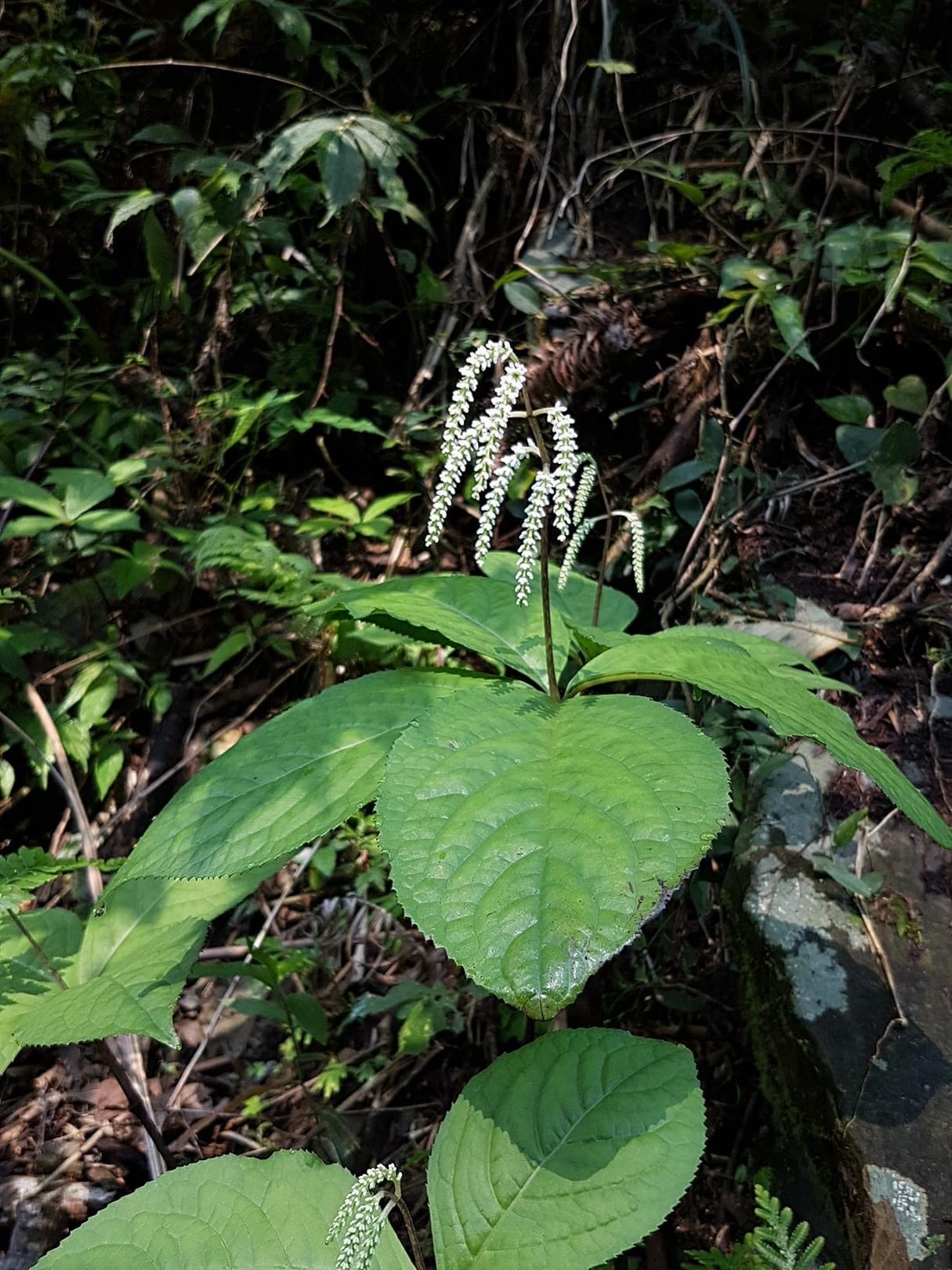 (原生種;原生於台灣和菲律賓;一年生草本;單莖直立;單葉十字對生,莖節短,近似輪生,有葉4枚或6枚,橢圓形至倒卵形,細鋸齒緣,葉尾尖;穗狀花序,3~8枝,排成總狀,頂生;無花瓣和花萼,每朵花有雄蕊3枚,白色,中間較大,前端圓形)