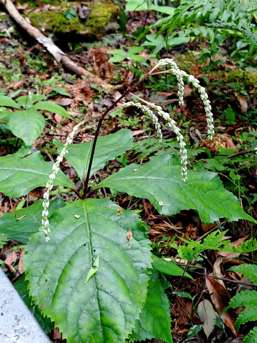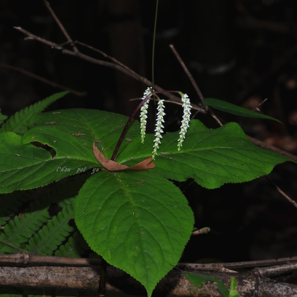 ![]() 上面照片:鄭演義拍攝 (單葉十字對生,莖節短,近似輪生,有葉4枚或6枚,橢圓形至倒卵形,細鋸齒緣,葉尾尖;穗狀花序,3~8枝,排成總狀,頂生) |