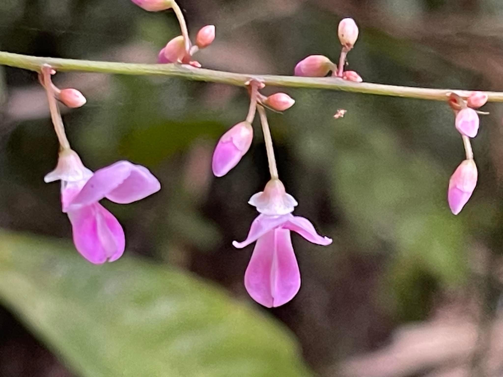 ============= 豆科 琉球山螞蝗 (Hylodesmum laterale、側序長柄山螞蝗) ============= (原生種;多年生半灌木;植株直立,分枝多;三出複葉,互生;小葉卵形至卵狀披針形,葉背的小葉脈比較明顯,葉脈間的白色斑塊較小;假總狀花序,頂生;蝶形花,粉紅色,花梗長度約0.5公分;莢果2~4節,各節呈三角狀,長寬相當)