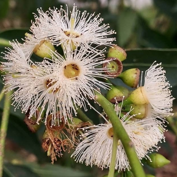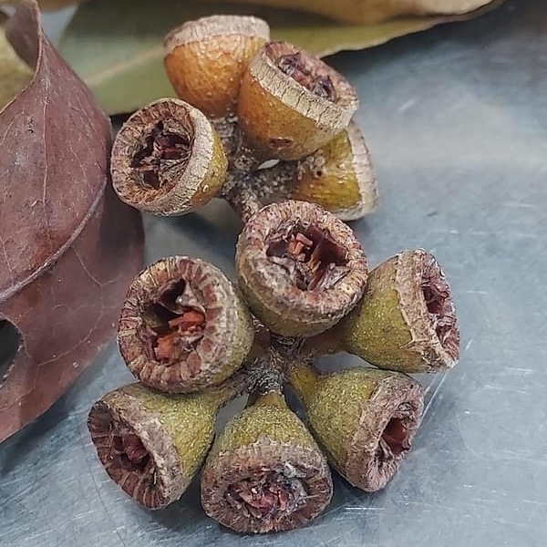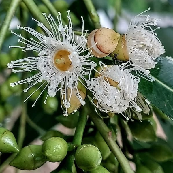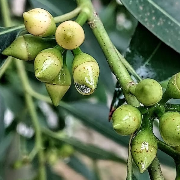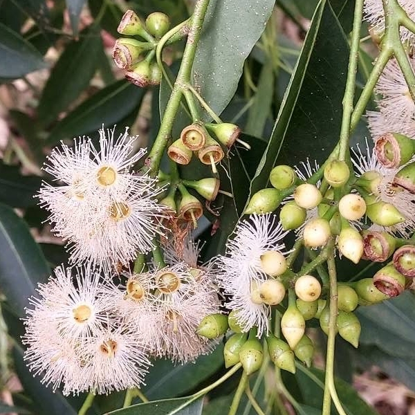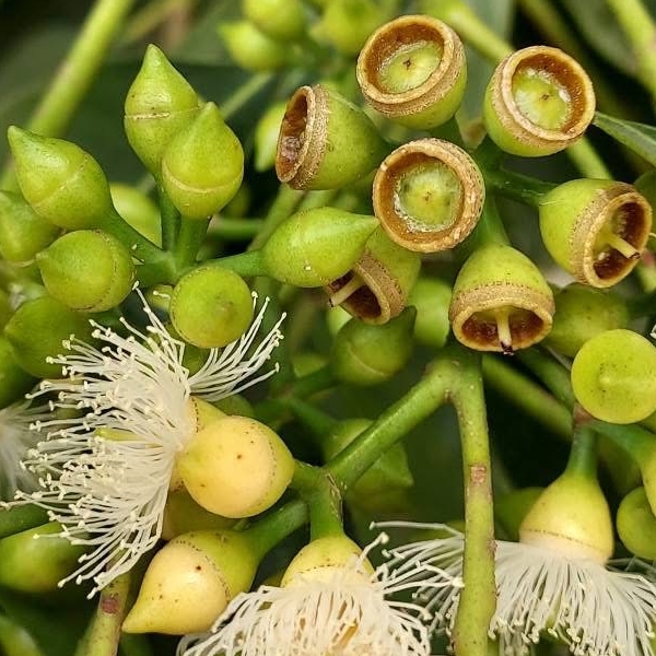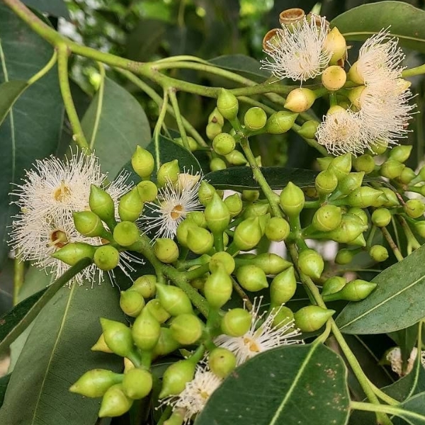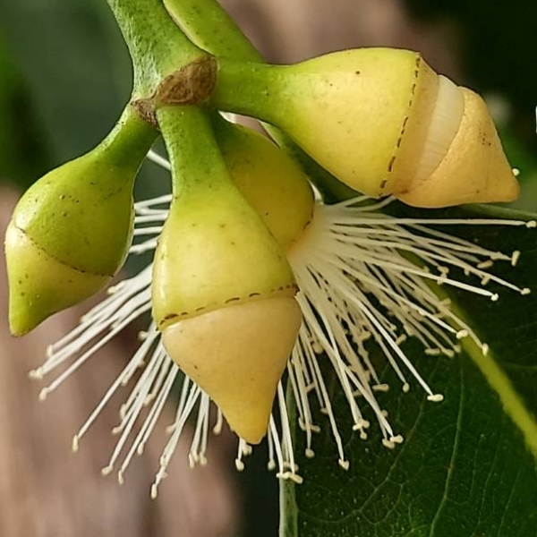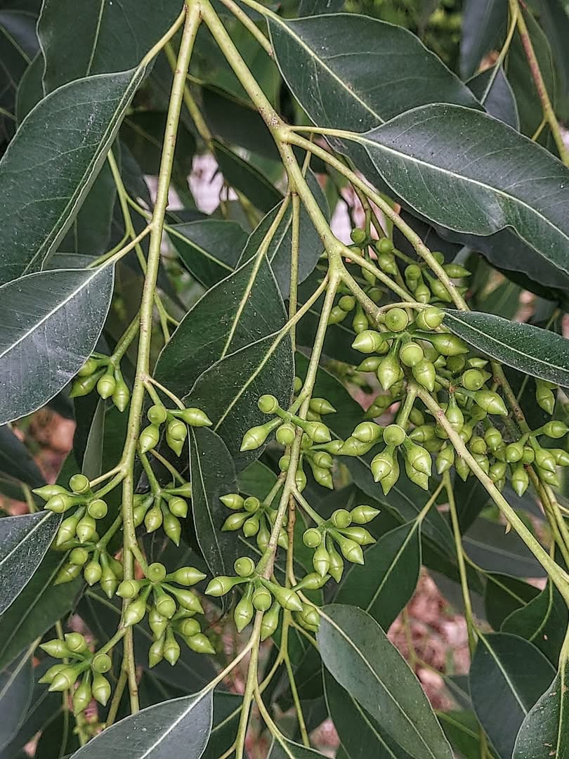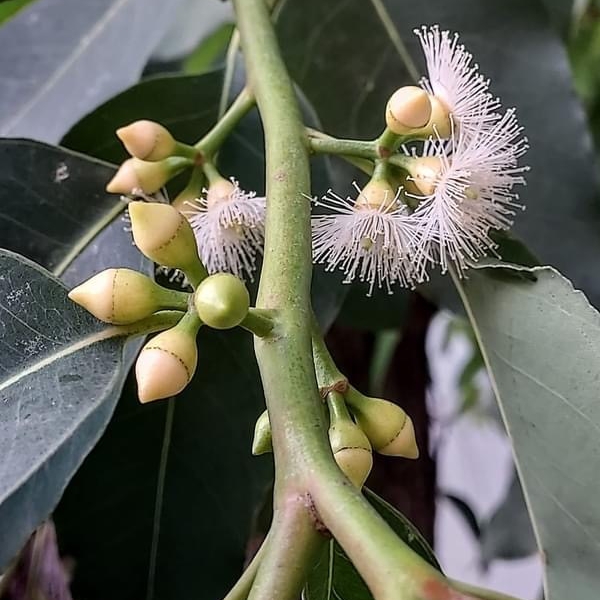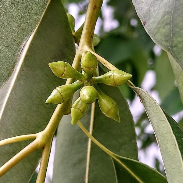 (栽培種;常綠中喬木至大喬木,樹高可達20公尺以上;樹皮深紅褐色,鬆軟;單葉互生,長卵形至披針形,搓揉有芳香氣味;繖形花序,腋生,每花序4~10朵花,花冠白色,雄蕊多數;開花時花蓋脫落;蒴果盃形)