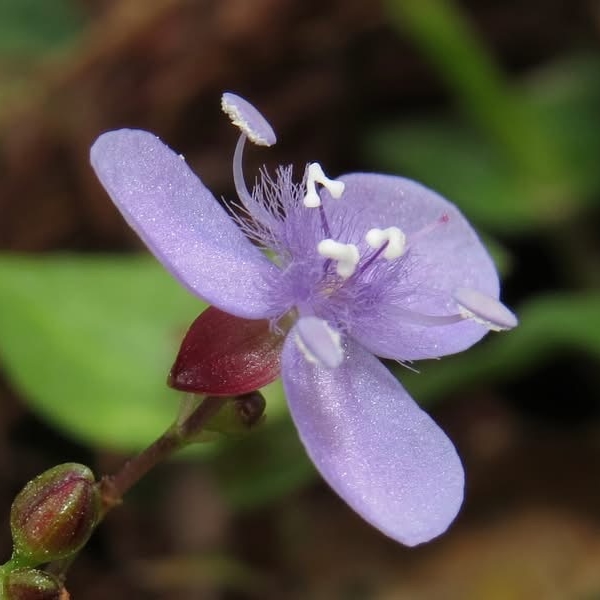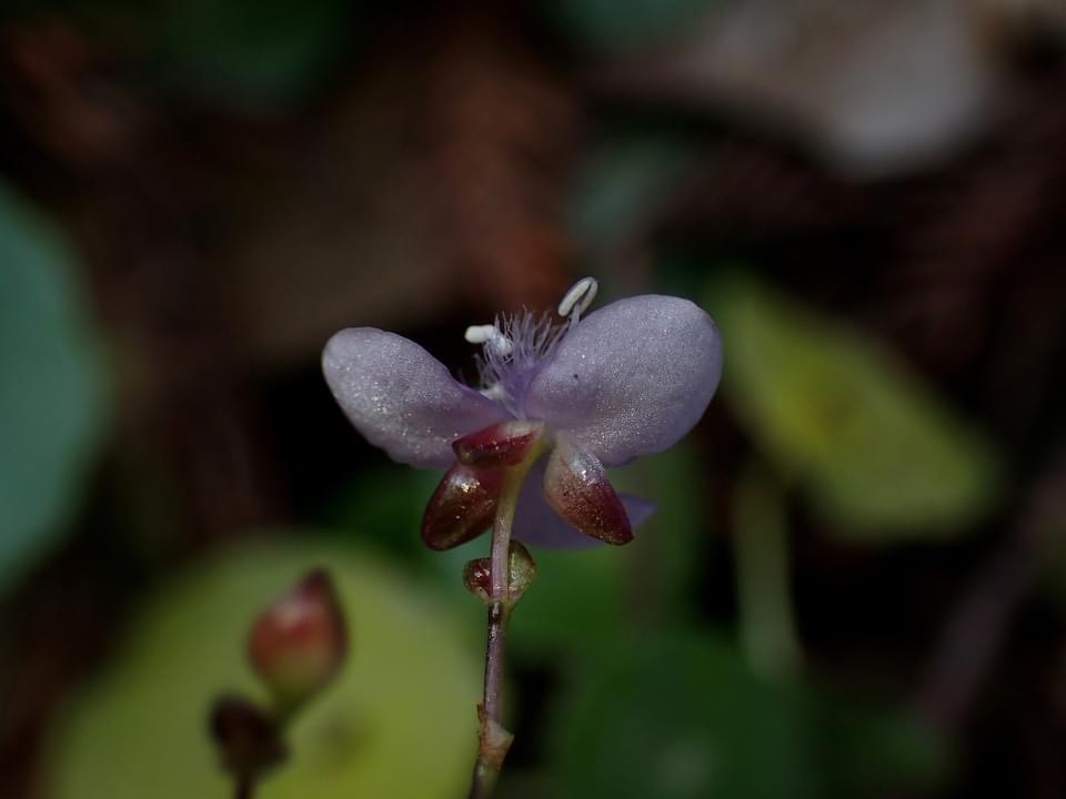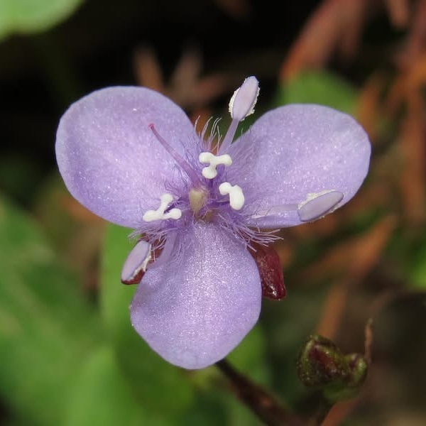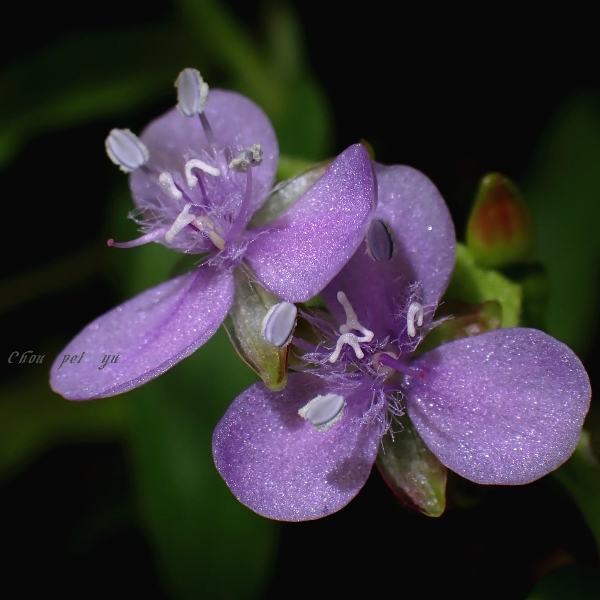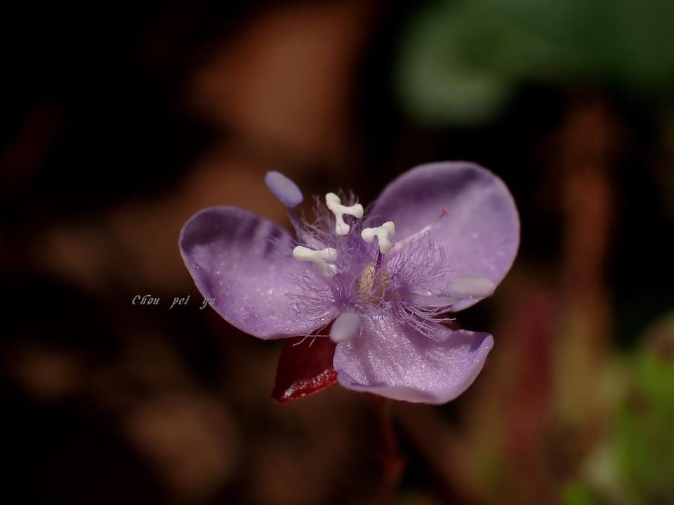 ![]() 上面照片:周佩玉拍攝於台北植物園 (花瓣3枚,倒卵圓形,粉紫色,花心密被條毛;可孕雄蕊3枚,不孕雄蕊3枚,雌蕊柱頭單一) |