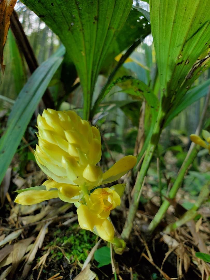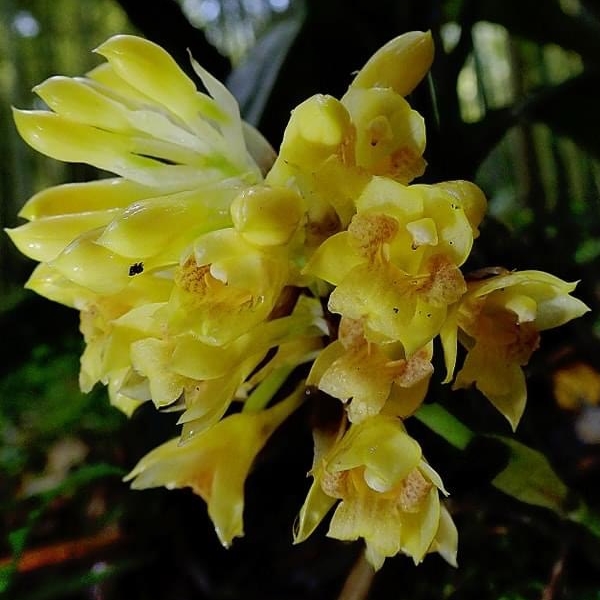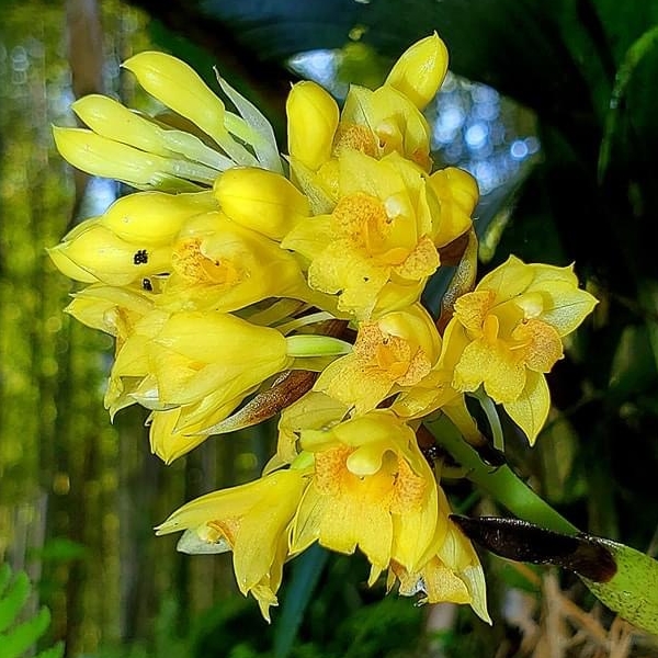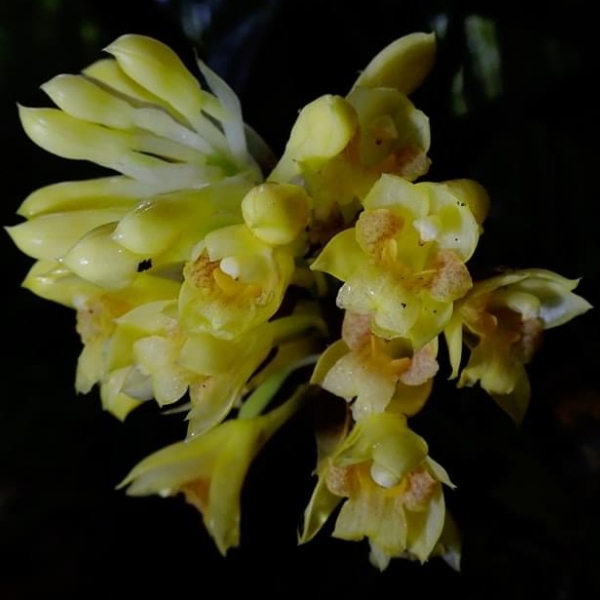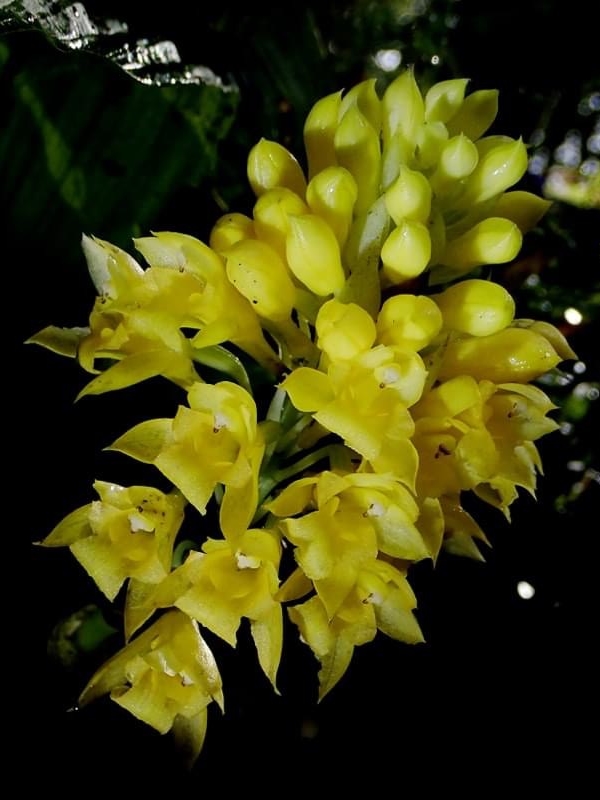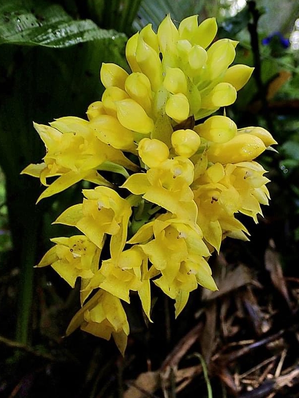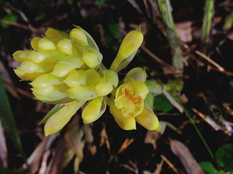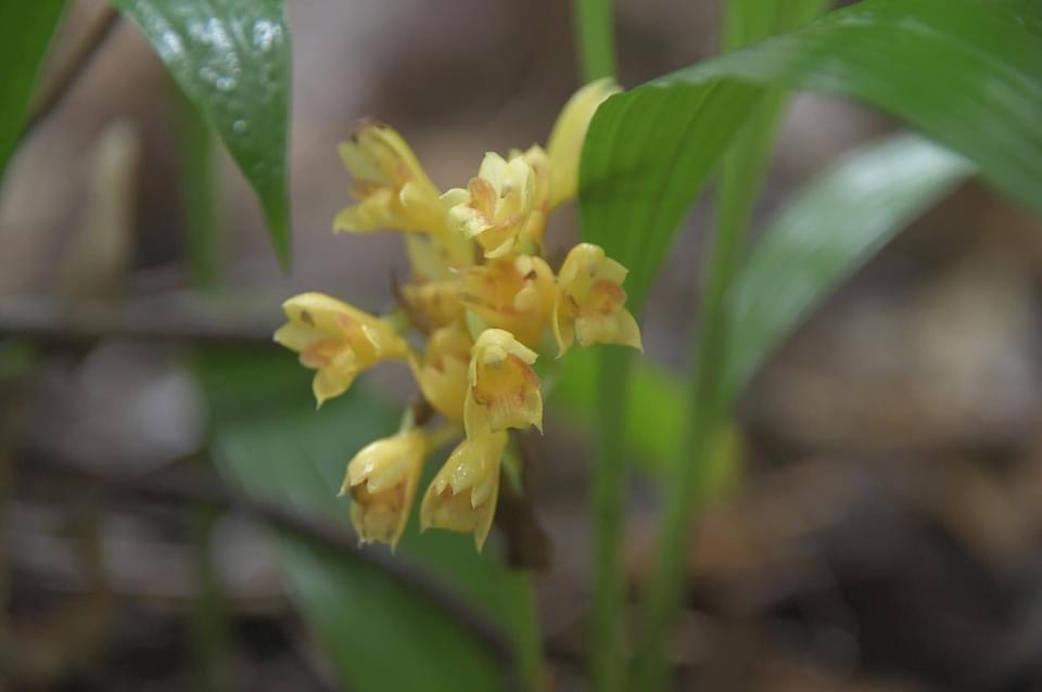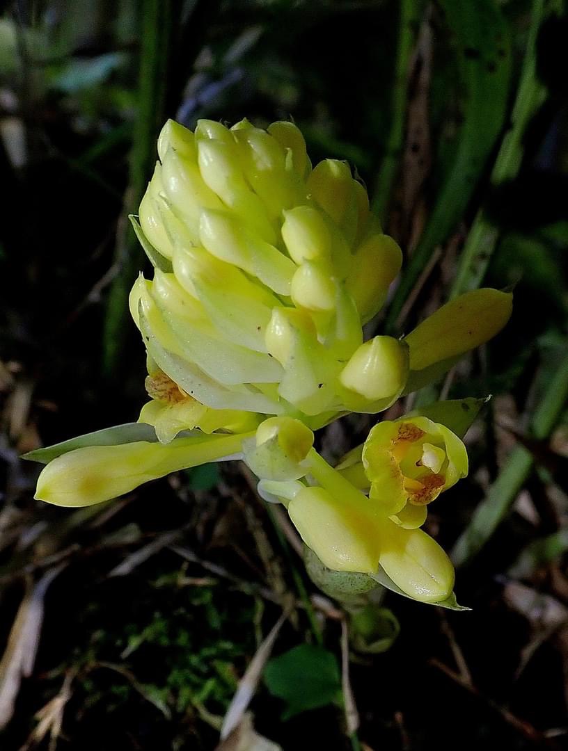(原生種;原生於台灣、中國大陸至中南半島一帶;世界植物在線 POWO 標示 Styloglossum densiflorum = Calanthe densiflora,皆為有效學名,附有照片;Styloglossum = 落苞蘭屬;Calanthe = 根節蘭屬;地生蘭;花莖根生,較短,約20公分,花冠黃色,花距細長,側萼片具明顯尾尖)