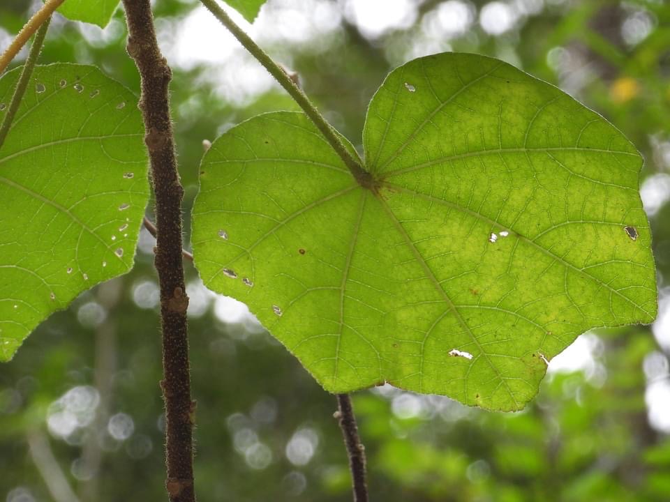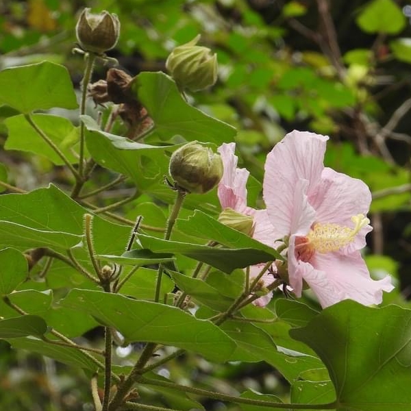 (原生種;世界植物在線 POWO 附有照片,標示僅原生於日本(不含台灣,但地域推論,台灣可能北部和東部有零星分布);喬木;小枝、新枝和葉柄密生星狀毛和短絨毛;單葉互生,葉面密被短絨毛;花朵單生葉腋,具長梗;花瓣5枚,淡粉紅色,略向後平展;雌雄蕊合生,雄蕊多數,雌蕊柱頭5叉;副花萼約8枚,線形,密被星狀毛和短絨毛)