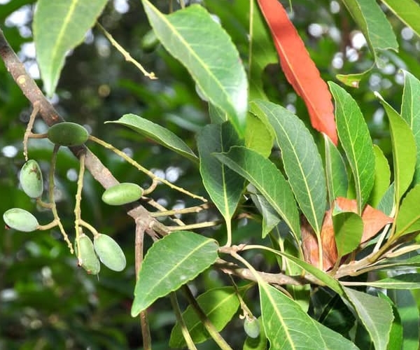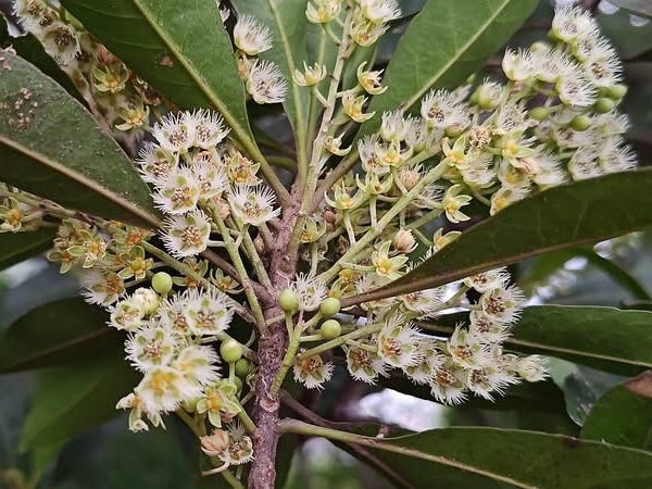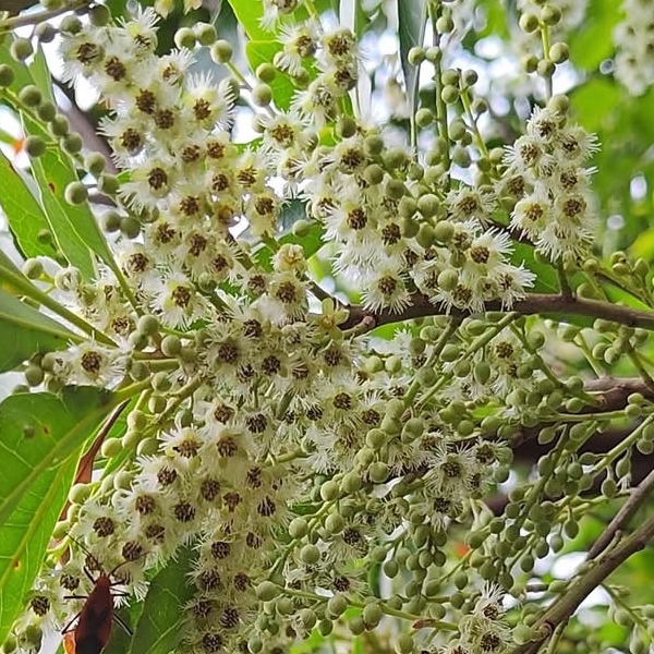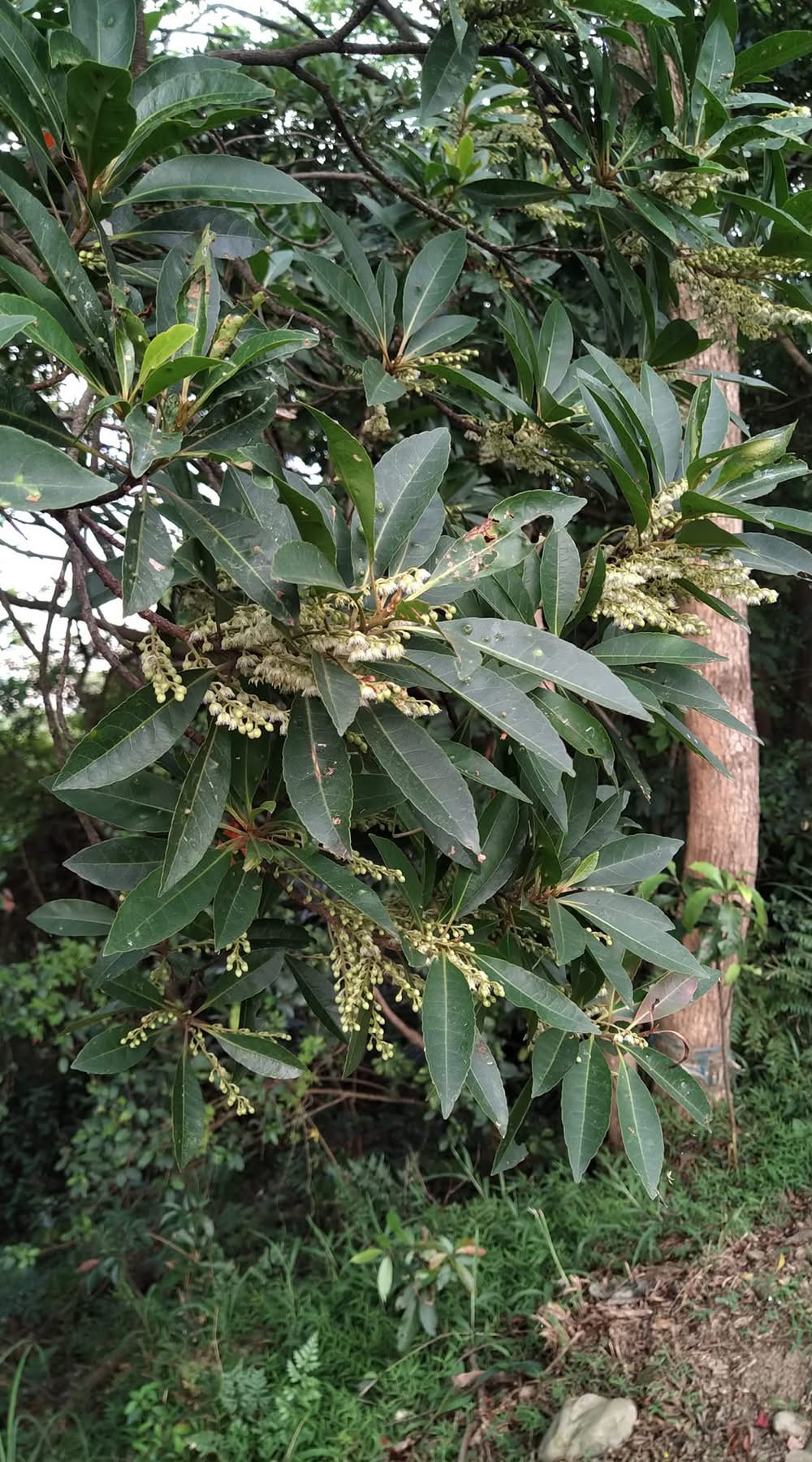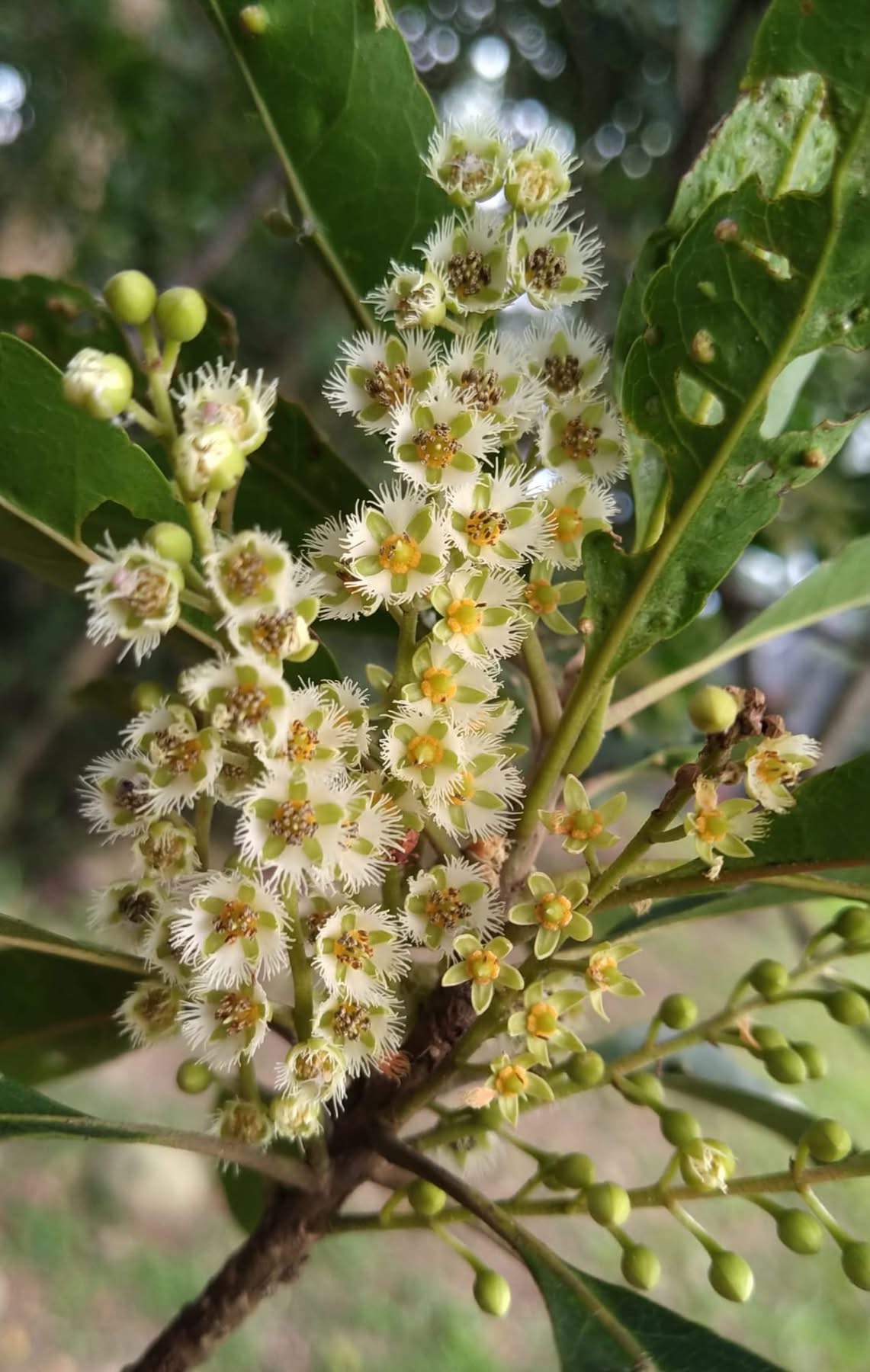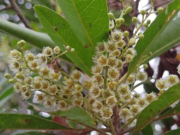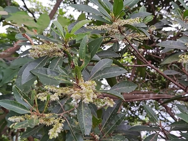(原生種;維基百科標名杜英,別名山杜英、膽八樹;常綠喬木,高度可達10公尺左右;單葉互生,長橢圓形至倒披針形,鈍鋸齒緣,葉長4~8公分;葉有小柄,長1~2公分,一端膨大;總狀花序,花瓣5枚,白色,先端剪裂狀;核果橢圓形)
