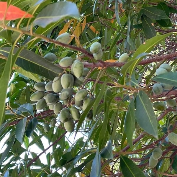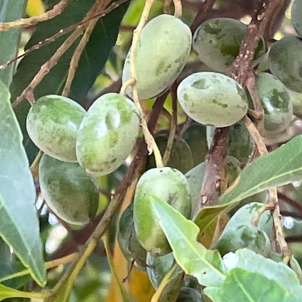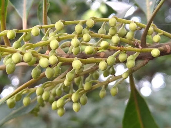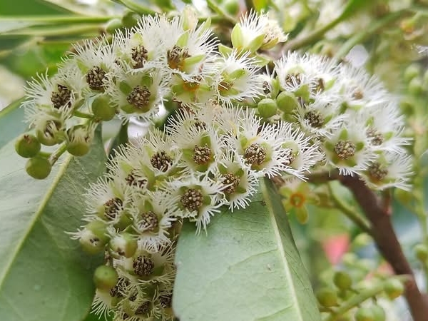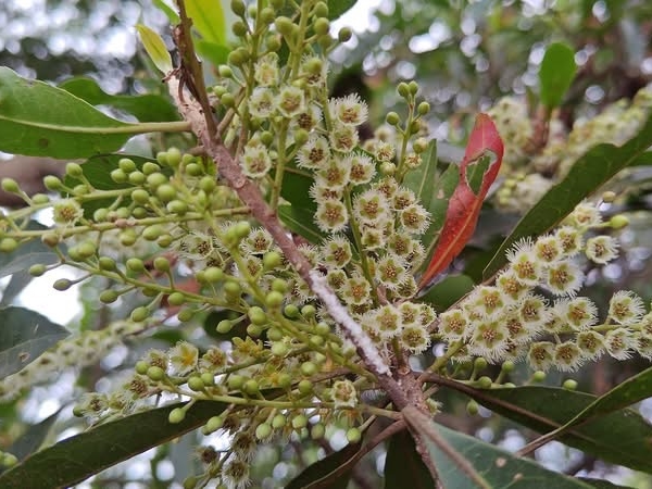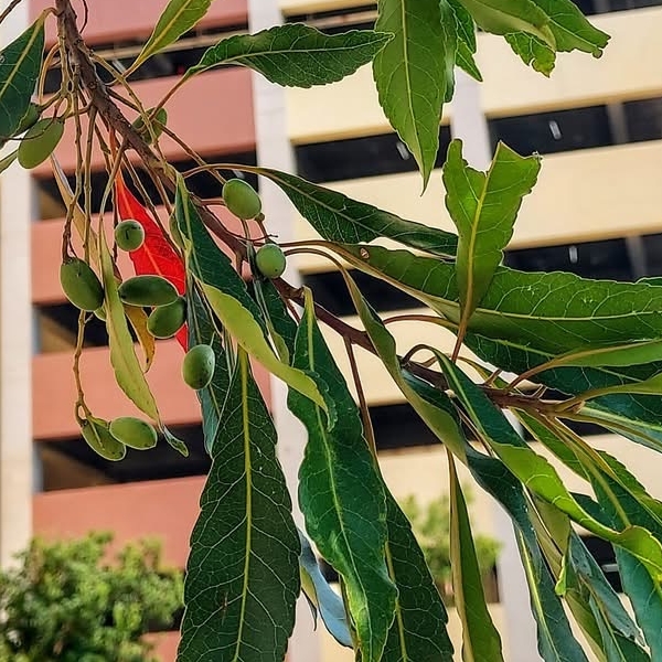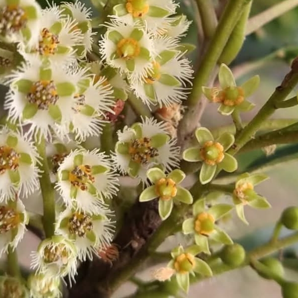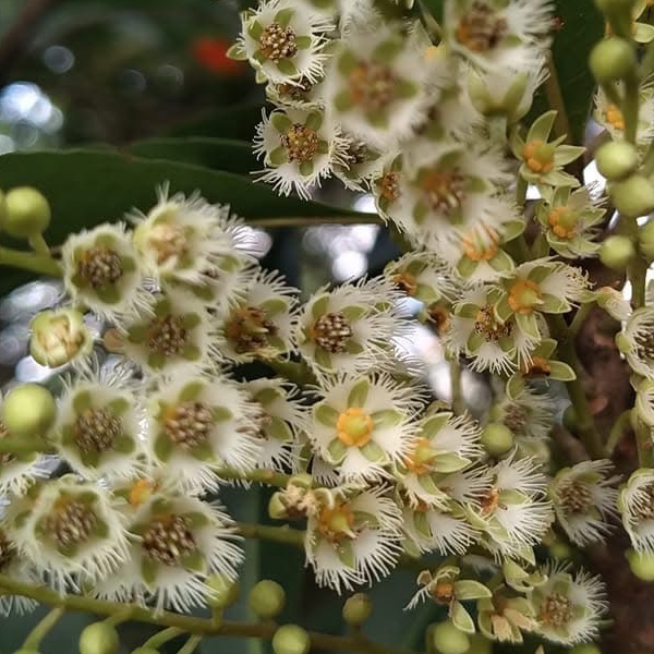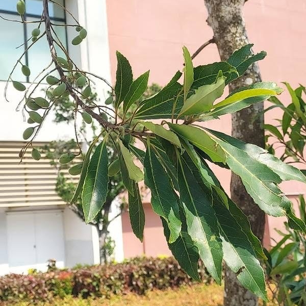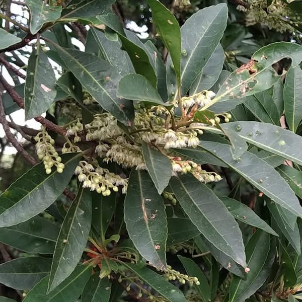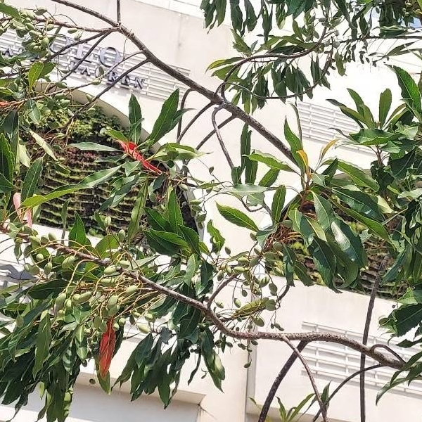 (原生種;維基百科標名杜英,別名山杜英、膽八樹;常綠喬木,高度可達10公尺左右;單葉互生,長橢圓形至倒披針形,鈍鋸齒緣,葉長4~8公分;葉有小柄,長1~2公分,一端膨大;總狀花序,花瓣5枚,白色,先端剪裂狀;核果橢圓形)