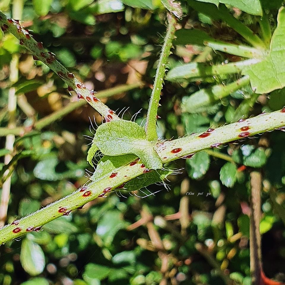 ![]() 上面照片:小花老師拍攝於台北動物園 (莖和花梗具倒鉤刺,刺基紅褐色) |