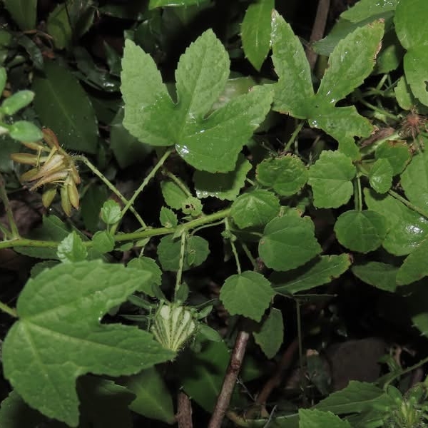 (原生種;世界植物在線標示原生於中國大陸至非洲及印尼一帶(未包含台灣);台灣物種名錄標示為原生種;蔓性草本或半灌木;全株具刺(莖刺倒鉤);單葉互生,圓心形至掌形(葉形變化大),鋸齒緣,具長柄;花朵單生葉腋,具長梗;花萼2層,外側的副花萼10枚,匙形,平展,中間具直立長刺狀附屬物,具緣毛;花瓣5枚,黃色,基部紅色;蕊柱合生,雄蕊多數,分布側面;雌蕊柱頭5叉,柱頭暗褐色;蒴果包覆於宿存花萼中;蒴果成熟開裂,種子多數,顆粒狀,棕色)