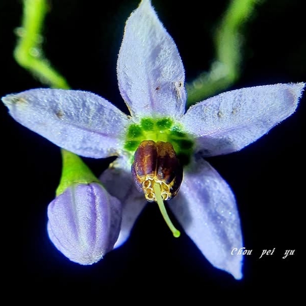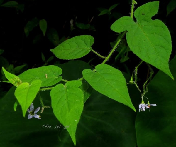(原生種;多年生草質藤本;全株密被白毛;單葉互生,卵形至三出狀;圓錐花序,腋生,花序長,多分枝;花瓣5枚,藍紫色或白色,花心有一圈綠斑(10枚);漿果卵球形,成熟紅色)