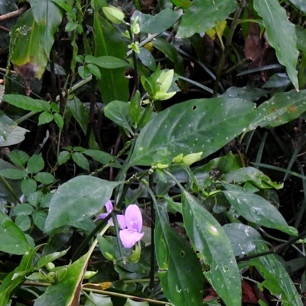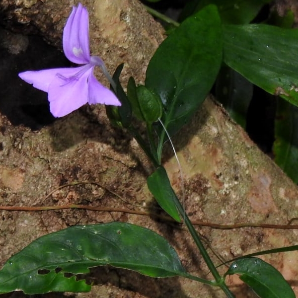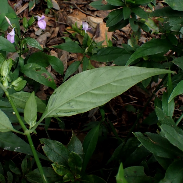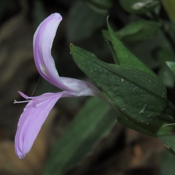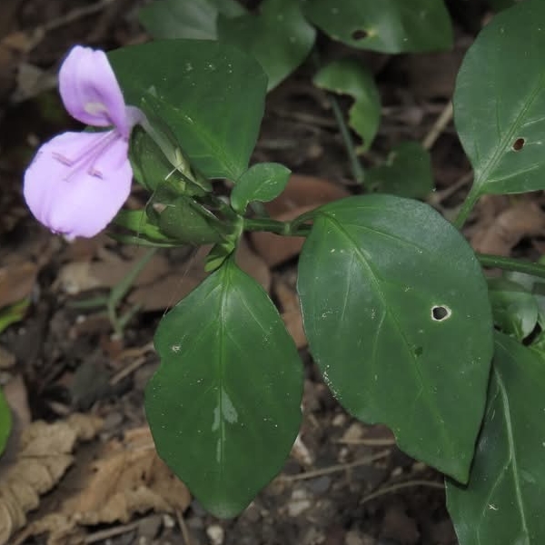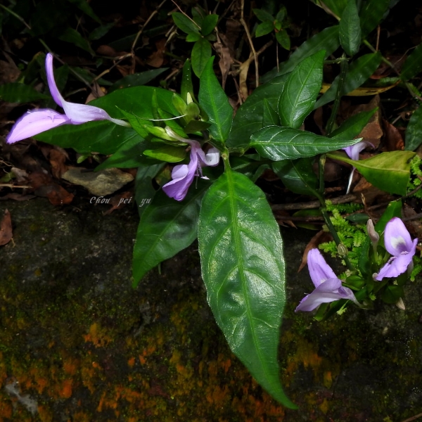 (原生種;原產於台灣至馬來西亞一帶;世界植物在線標示 Peristrophe baphica = Dicliptera tinctoria,皆為有效學名;維基百科將 Peristrophe baphica 標名觀音草;多年生草本;單葉對生,卵形至卵狀披針形,全緣;聚繖花序,由2或3個頭狀花序組成,腋生或頂生;花冠粉紅色,2唇形,花筒細長;雄蕊2枚,柱頭末端分叉;總苞片2~4枚,卵形)
