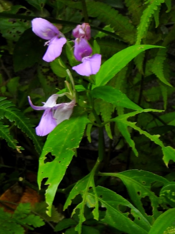![]() 上面照片:周佩玉拍攝 (聚繖花序,由2或3個頭狀花序組成;花冠粉紅色,2唇形,花筒細長;雄蕊2枚,柱頭末端分叉) |