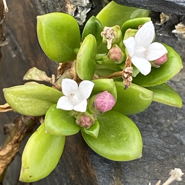![]() 上面照片:蟹老闆拍攝於宜蘭縣南方澳豆腐岬 (多年生草本;生於海邊礁岩上;單葉對生,肉質,橢圓形至長橢圓形;聚繖花序,頂生,約10朵;花瓣4枚,白色,喉口被毛;蒴果杯狀,花萼4枚宿存,齒狀) |