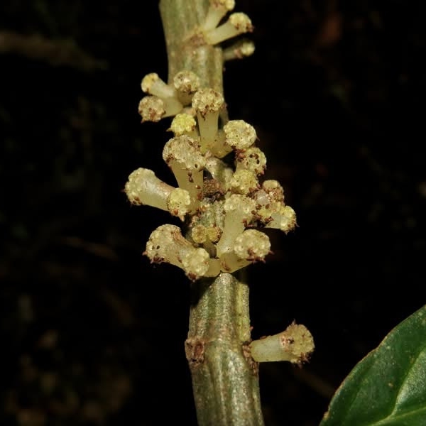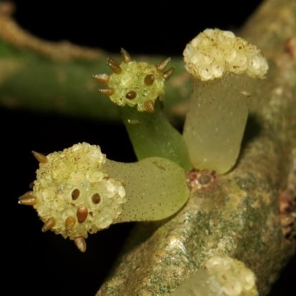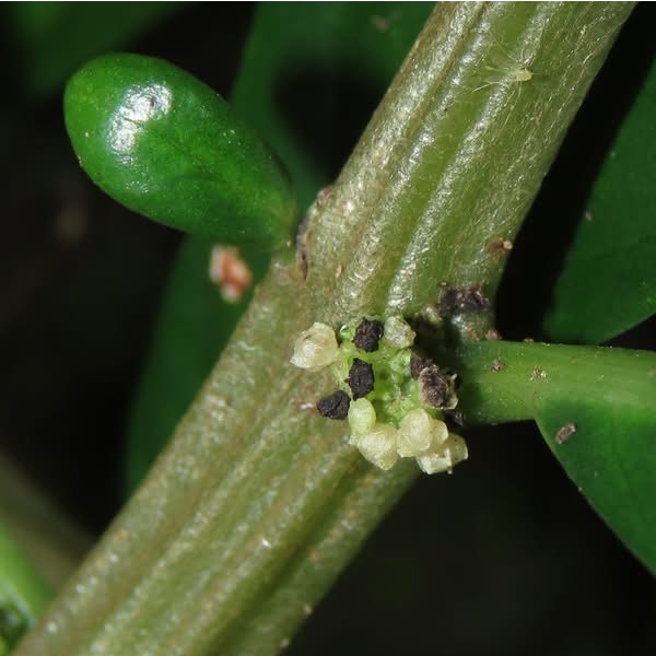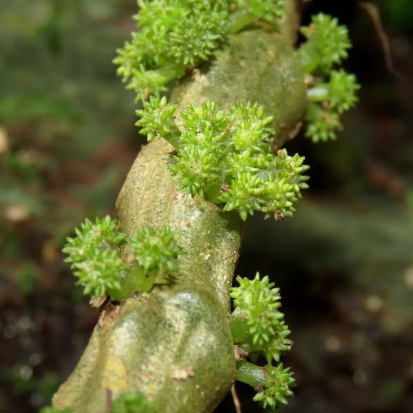 (原生種;多年生草本或小灌木;著生於樹幹或岩石上;莖具多條縱稜,木質化;單葉互生,多呈長橢圓形;枝端可見退化的對生葉;頭狀花序,叢生莖節;花朵單性,雄花生於雌花旁,花被片4~5枚;花梗隨果熟而變大,圓柱形,白色;上面有種子多枚,棕色)