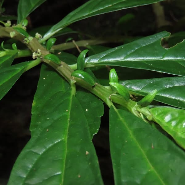 ![]() 上面照片:Ramar Kao 拍攝 (多年生草本或小灌木;著生於樹幹或岩石上;單葉互生,多呈長橢圓形;枝端可見退化的對生葉) |