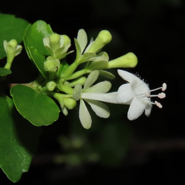 (台灣特有種;台灣紅皮書標示易危;低矮灌木,株高約1~2公尺;單葉對生,寬卵形(長度不到2公分)、卵形至橢圓形,微鋸齒或鈍鋸齒緣,葉有短柄;聚繖花序,生於枝端;花冠白色,漏斗狀,5瓣;雄蕊4枚;苞片2枚;花藥玫瑰紅色;核果圓柱狀,上端具宿存的長萼片,可助風力傳播種子)