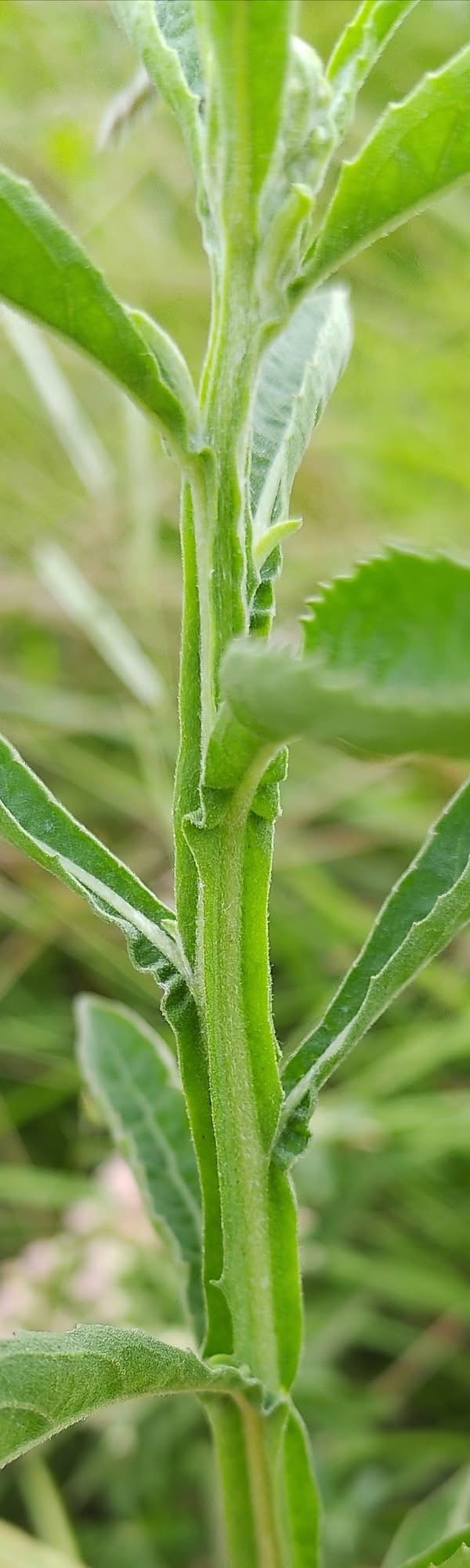 (歸化種;多年生草本;株高100~150公分;莖與分枝上有明顯翼狀構造;單葉互生,狹橢圓形至披針形)