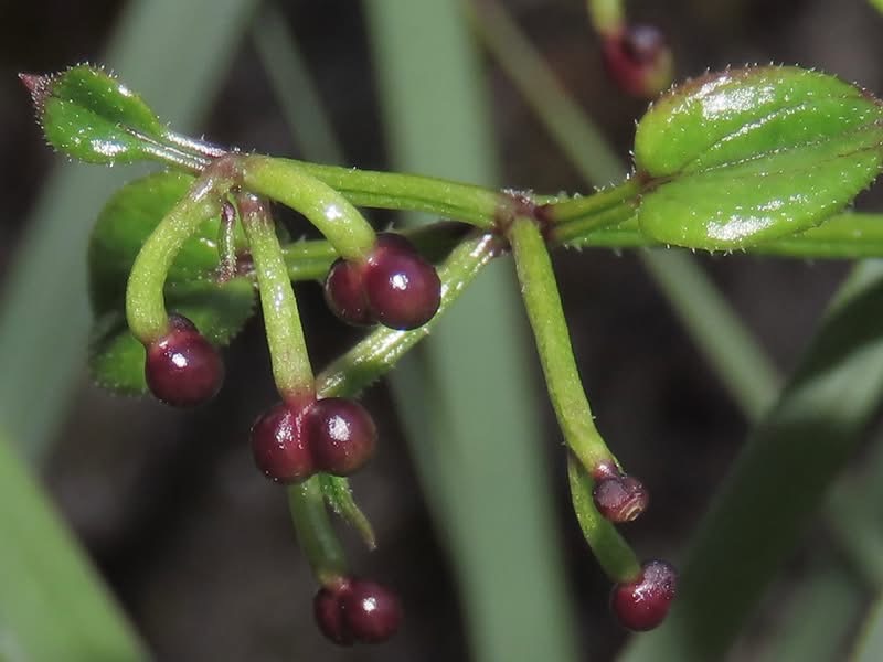 (原生種;原生於台灣、日本至中國大陸;世界植物在線 POWO 標示 Rubia akane var. erecta = Rubia akane = Rubia argyi,皆為有效學名;台灣物種名錄將 Rubia akane var. erecta 標名直立紅藤草,標示為台灣特有種,將 Rubia akane var. akane 標名紅藤仔草,標示為原生種;維基百科將 Rubia argyi 標名東南茜草,附有照片;蔓性草質藤本;莖條細長,全株具倒鉤刺,莖節常呈紫紅色;單葉4枚輪生,卵狀心形至長卵形,具長柄;聚傘花序,腋生或頂生;花朵小形,淡黃色;果實雙球形,成熟紫紅色)