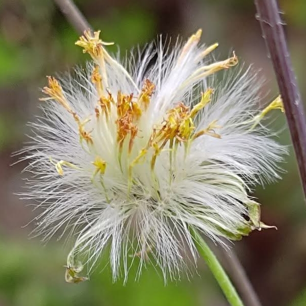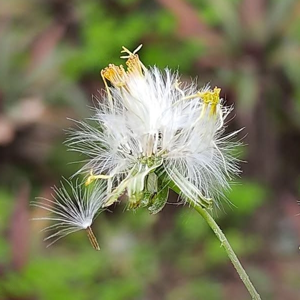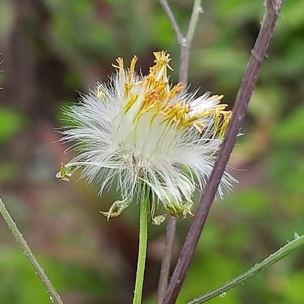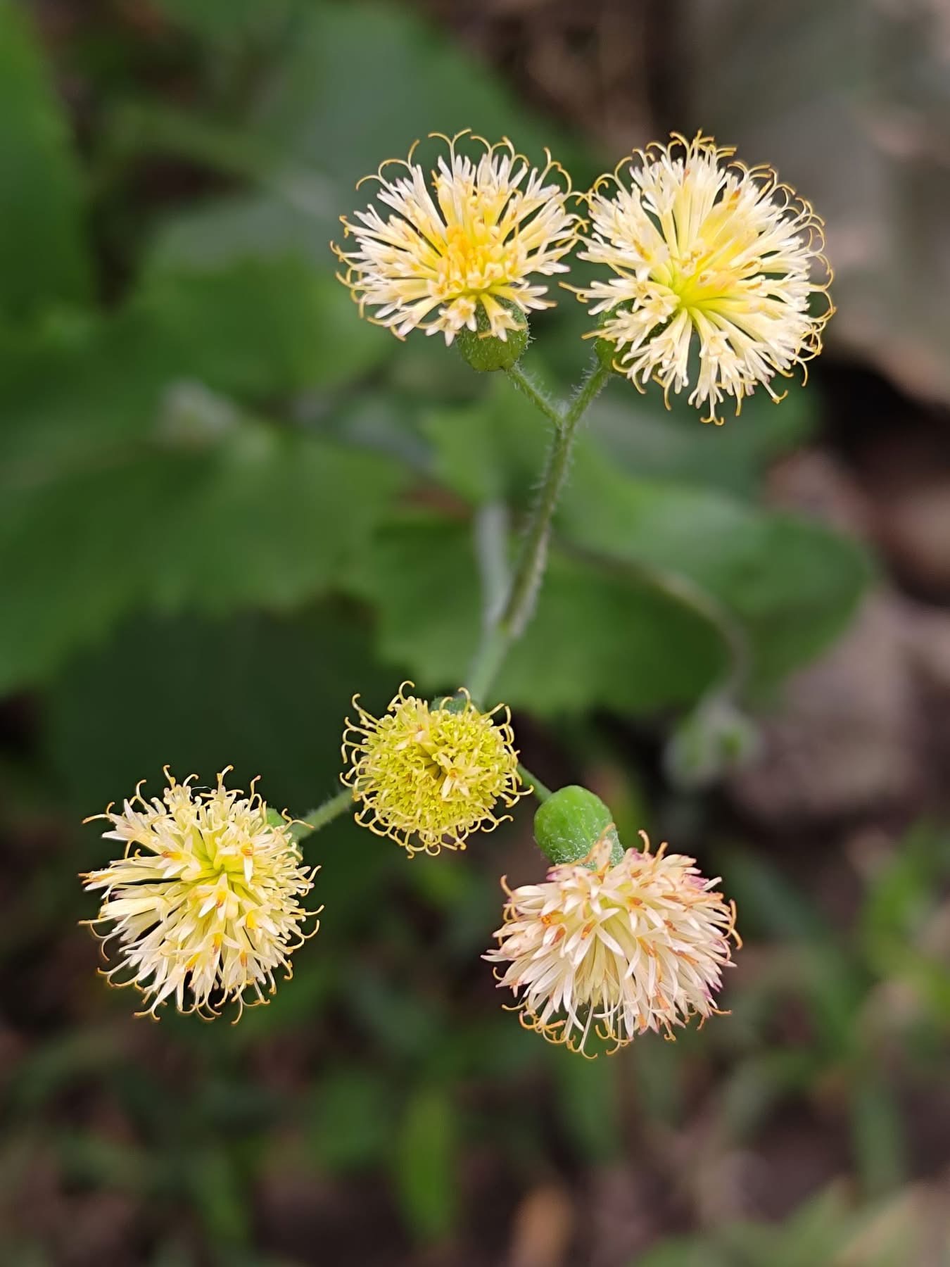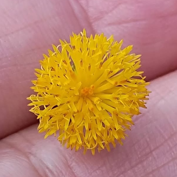 (歸化種;原產於非洲中西部一帶;台灣物種名錄標名粉黃纓絨花;一年生草本;莖直立或近基部傾斜,少分枝;基生葉叢生狀,莖生葉單葉互生,葉形變化大;頭花2~5朵排成繖房狀,頂生;花蕾期略微彎垂,花冠淡黃色至淺橘色;雌蕊2叉,伸出花冠外;總苞長筒形,總苞片單層,等長,被毛;瘦果5稜,冠毛白色)