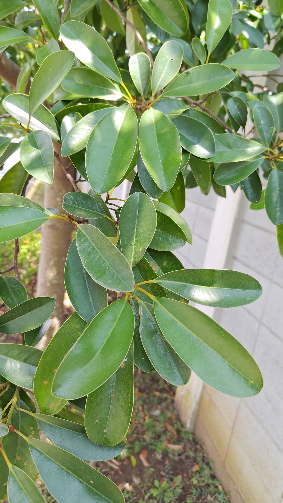 ![]() 上面照片:林美燕拍攝 (單葉互生,倒卵形、倒長卵形至橢圓形,厚革質,長寛比約2~2.5倍) |