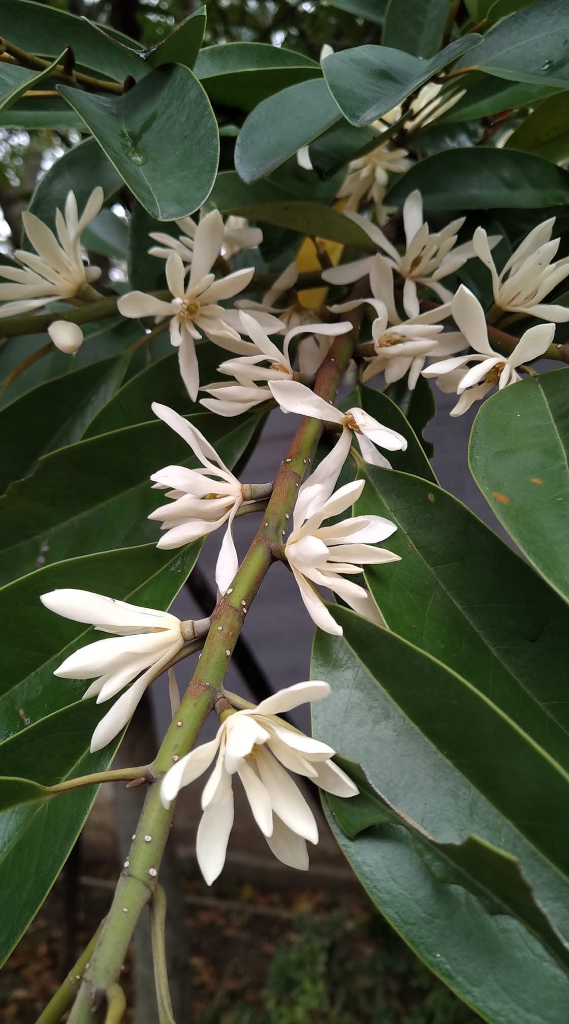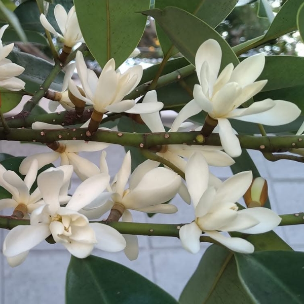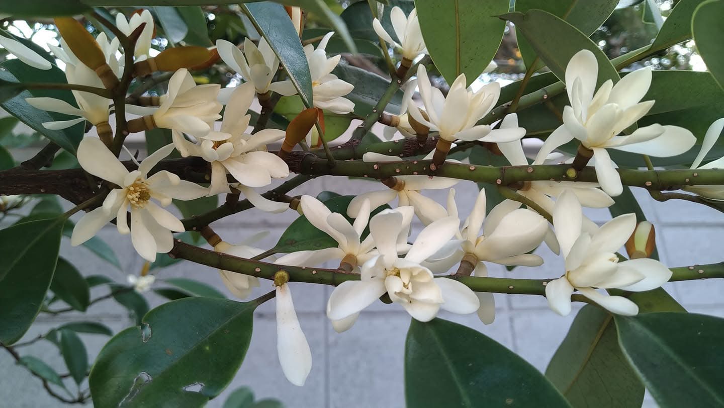 ![]() 上面照片:林美燕拍攝 (花朵單生葉腋,花被片白色至乳黃色(花色可能會隨成熟度變化),花型較烏心石大;通常先長葉芽,再生花苞,花梗顯得較長,有時疑似花梗的中間會長出葉片) |