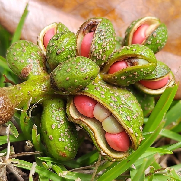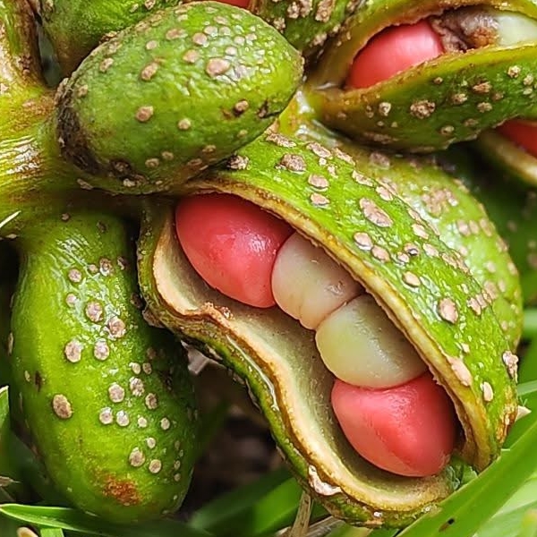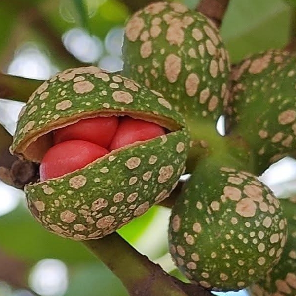 ![]() 上面照片:林美燕拍攝 (蓇葖果,卵形,徑約1公分,果皮上有白斑,成熟迸裂,內有1~4顆種子,成熟紅色) |