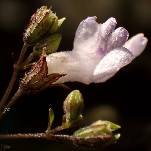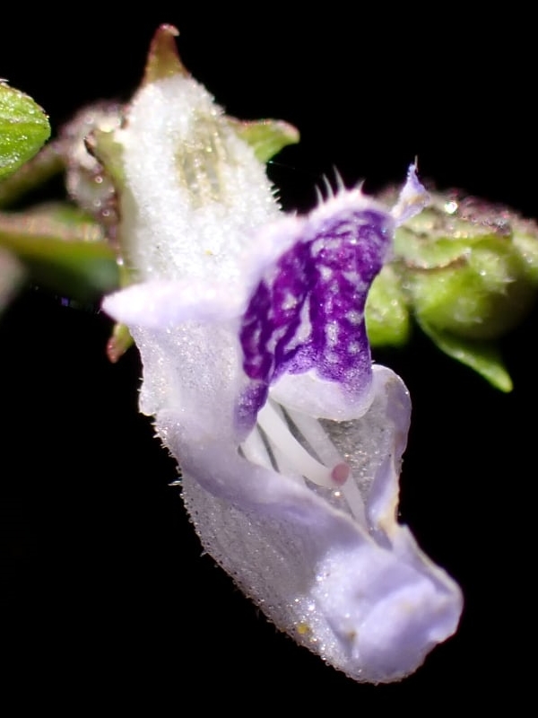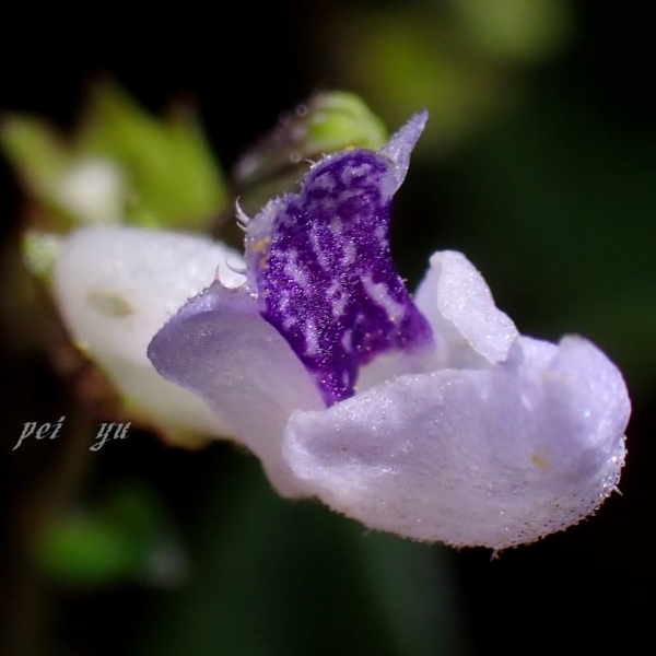 ![]() 上面照片:周佩玉拍攝 (花冠筒狀,船形,白色帶紫色,上唇紫色;雄蕊4枚) |