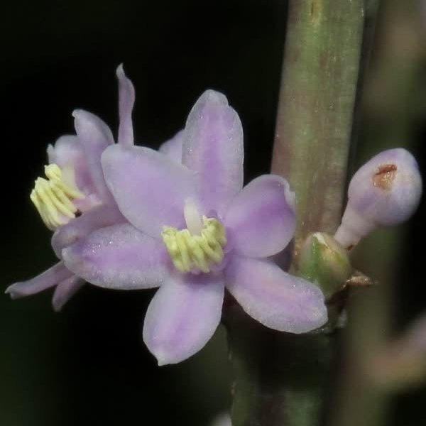 (原生種;原生於台灣、日本、高麗半島和中國大陸;世界植物在線 POWO 附有標本照片;台灣物種名錄標名小麥冬,標示栽培種;維基百科標名矮小山麥冬,附有照片;多年生草本;單葉互生,叢生,線形,細鋸齒緣;葉寬小於0.4公分;總狀花序;花序長12公分以下,有5~10節;花被片6枚,白色至淡粉紅色;核果球形,成熟紫黑色)
