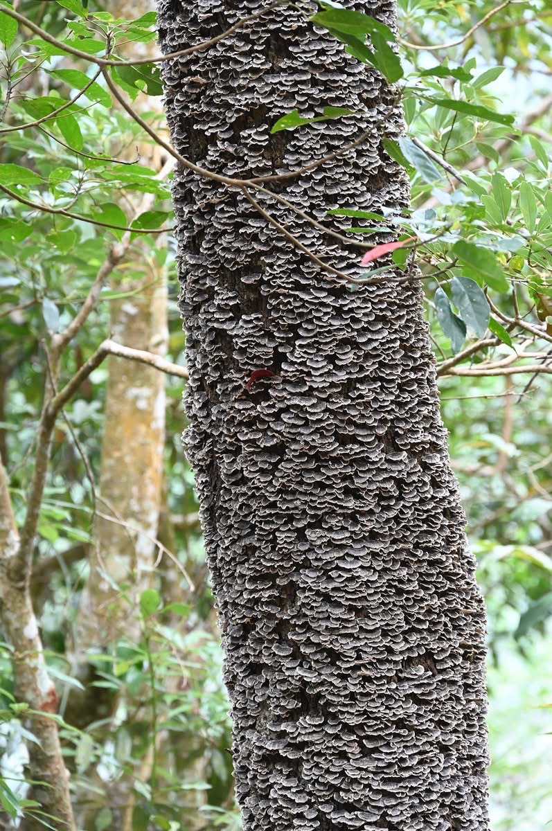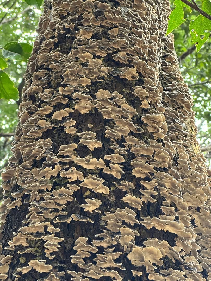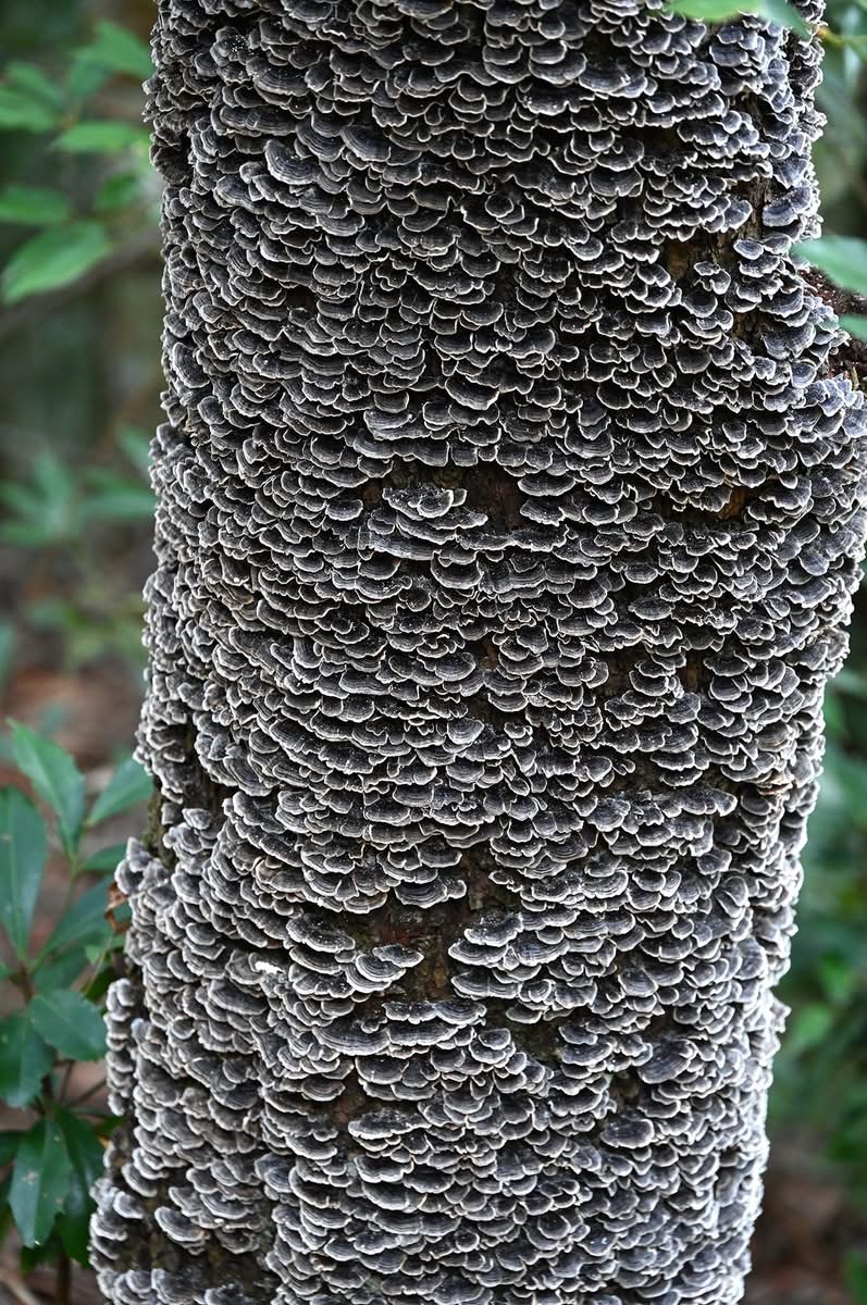 (原生種;其種加詞 versicolor意為變色的、顏色多樣的;維基百科標名雲芝,別名彩雲革蓋菌、瓦菌,附有照片;寄生枯木之真菌;菌體無柄;菌蓋半圓形至貝殼狀,表面粗糙,邊緣波浪狀,呈覆瓦狀或蓮座狀)