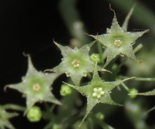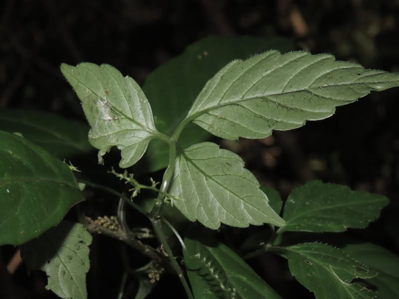 (原生種;原生於日本、印度和新幾內亞的三角區域 (世界植物在線 POWO 標示原生地不含台灣,但以區域推測,台灣應為原生地);蔓性草質藤本;雌雄異株;掌狀複葉,互生;小葉3~7枚,兩面被短毛)
