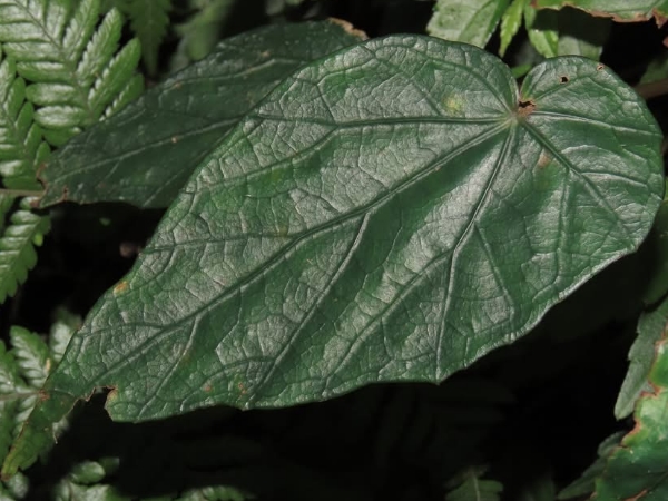 (台灣特有種;台灣紅皮書標示瀕危;台灣物種名錄附有照片;多年生草本;根莖匍匐,通常不具直立莖,常呈紫紅色;單葉互生,歪卵形至歪長卵形,全緣或近全緣,先端漸尖,具長柄,下表面葉脈呈紫紅色;掌狀脈,7~9條;花序總梗直立;花被粉紅色;雄花花被4枚(或6枚),雄蕊多枚,棍棒狀,黃色;雌花花被5枚,花柱2枚,皆2叉,黃色;蒴果下垂,三稜形,三翅不等大;種子多數)
