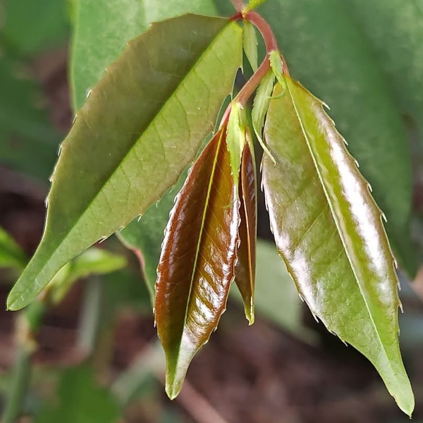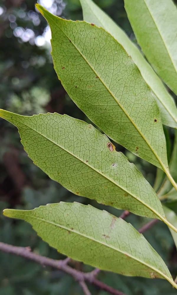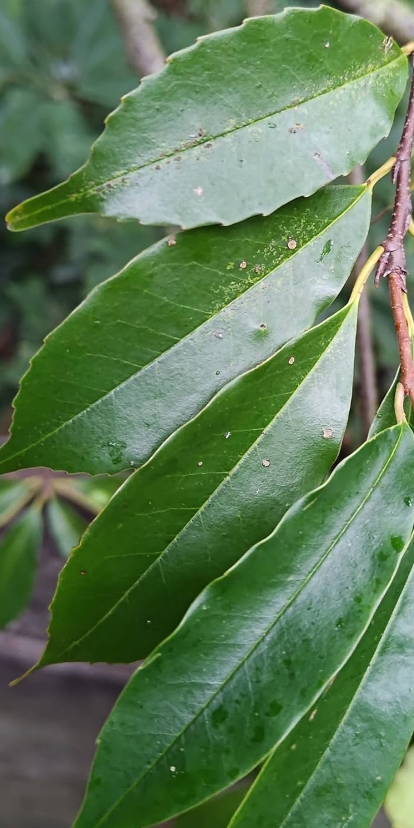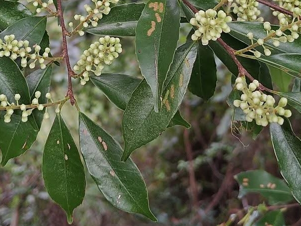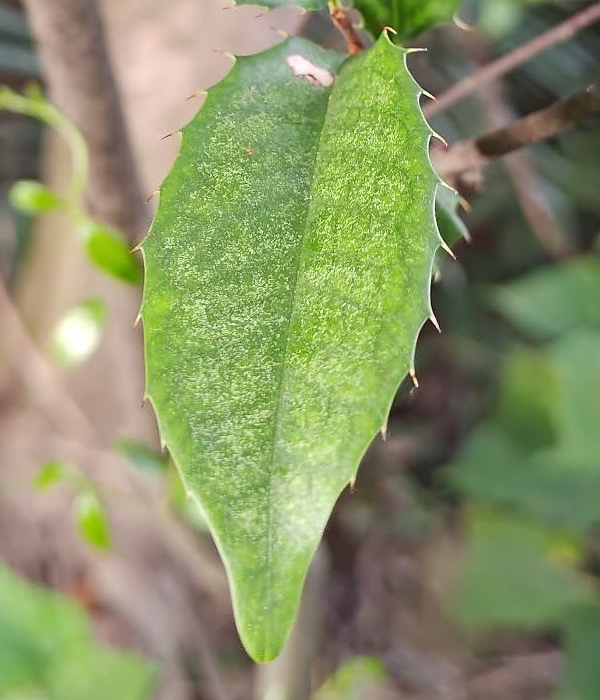 ![]() 上面照片:林美燕拍攝 (單葉互生,長橢圓形至倒卵狀披針形,刺鋸齒緣至全緣) |