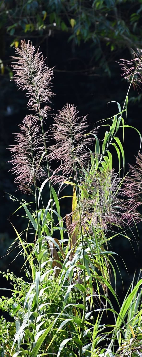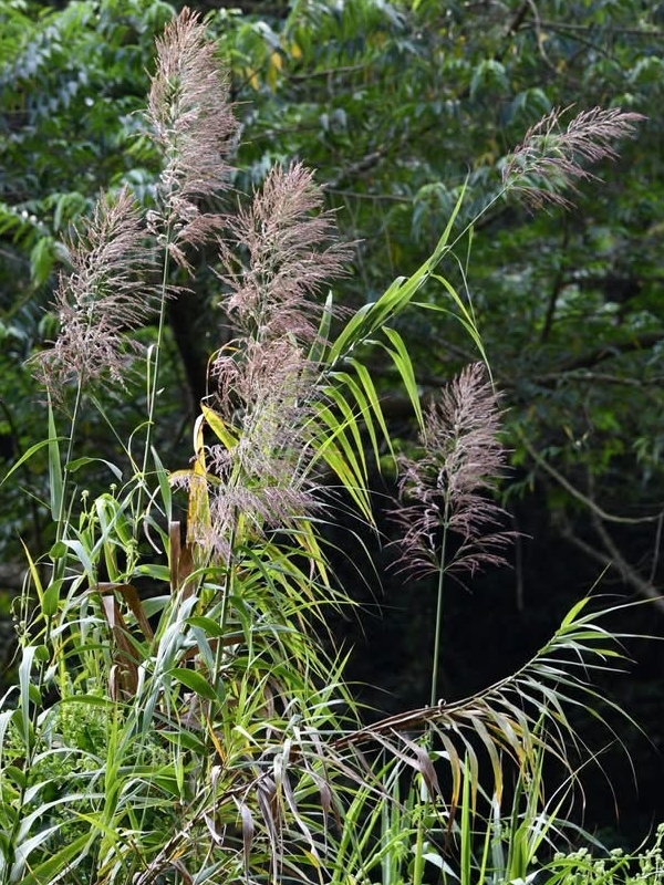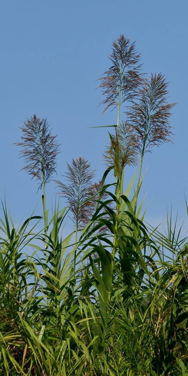 (原生種;世界植物在線 POWO 標示原生於日本至土耳其一帶(未包含台灣);台灣物種名錄標名蘆竹,標示為原生種;維基百科標名蘆荻;多年生草本;生長在離岸邊,高3~6公尺;莖粗硬、中空,挺直生長,常生分枝,主幹不具毛(像蘆葦,比蘆葦高大);圓錐花序,頂生)