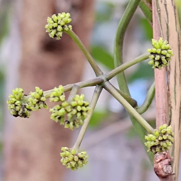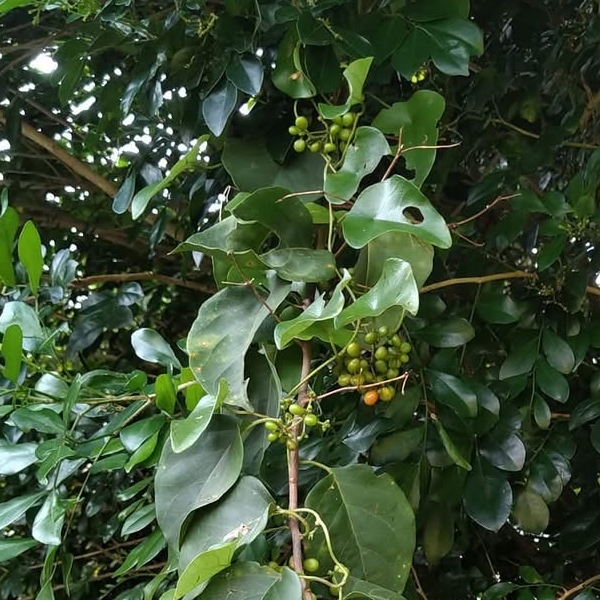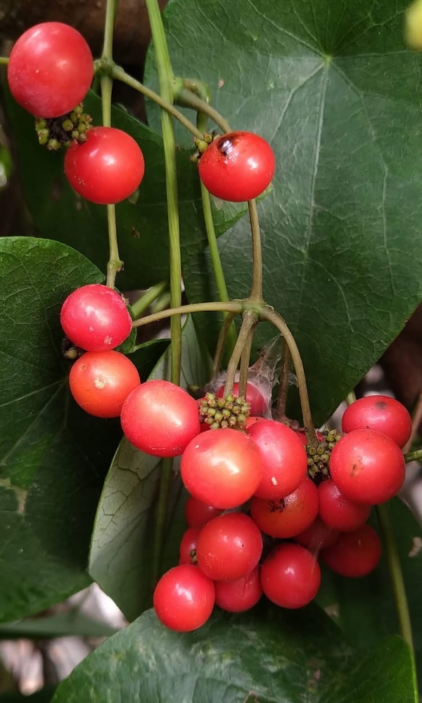 (原生種;原生於台灣、日本至印度和澳洲一帶;攀緣性木質藤本;單葉互生,卵形至三角形,全緣,葉面光滑,葉背灰白;花單性,雌雄異株;頭狀花序,呈複繖形花序排列,腋生,花朵極小;核果卵球形至扁球形,成熟紅色(綠-黃-紅))
