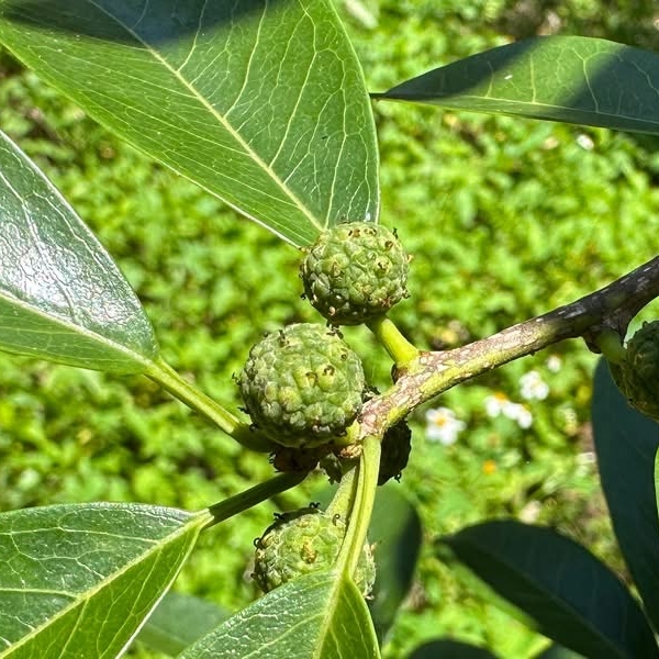 (原生種;柘音ㄓㄜˋ;原生於台灣、日本至印度和澳洲一帶;台灣物種名錄標名柘樹,別名刺格、葨芝、黃金桂、枸棘、大丁癀;維基百科標名構棘,別名刺格、葨芝、山荔子、穿破石;常綠攀緣性灌木;枝條蔓狀,具刺,小枝條常特化成刺;枝葉具白色乳汁;單葉互生,卵形、橢圓形至倒長卵形,全緣;花單性,雌雄異株;頭狀花序,腋生,單生或成對;雌蕊柱單一,彎曲狀;聚合果球形,成熟橙黃色,果徑約2公分,內含種子多粒)