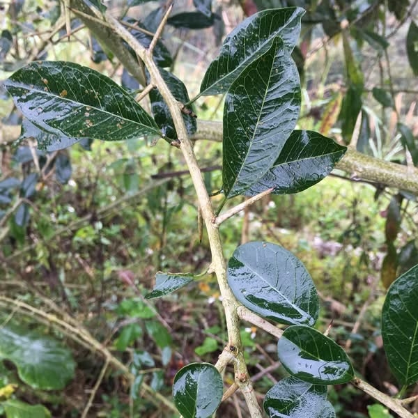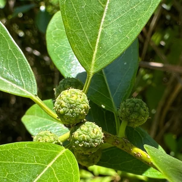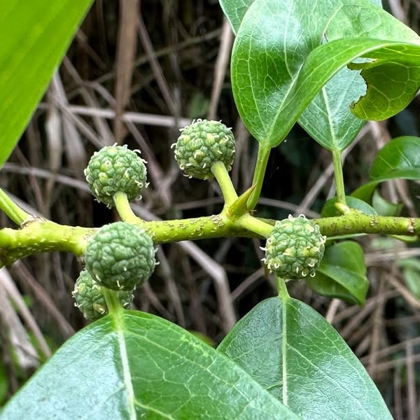 ![]() 上面照片:沈揮勝拍攝 (常綠攀緣性灌木;枝條蔓狀,具刺,小枝條常特化成刺;單葉互生,卵形、橢圓形至倒長卵形,全緣;花單性,雌雄異株;頭狀花序,腋生,單生或成對) |