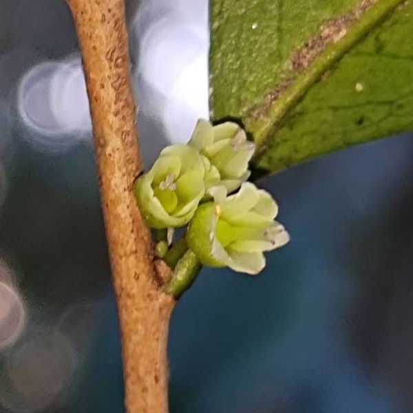 ![]() 上面照片:林美燕拍攝 (上面是雄株和雄花的照片;花單性,雌雄異株;花單生或2~3朵簇生於葉腋,花梗約與花苞等長或略短;花瓣5枚,白色,有濃郁香味;雄花雄蕊約15枚,無雌蕊;雌花雌蕊3叉,無雄蕊) |